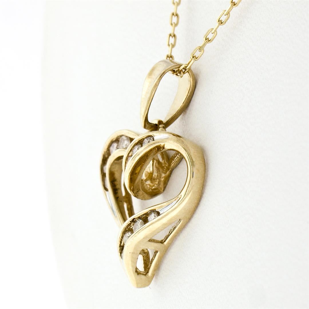 A 10k yellow gold open heart pendant necklace featuring 13 channel set round brilliant diamonds (I - I1/I2; 0.26ctw). 16 inch 14k yellow gold cable link chain, 3.75 grams total weight, pendant measures 17.8x17.8mm.