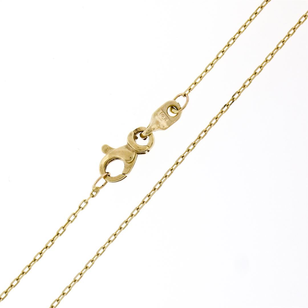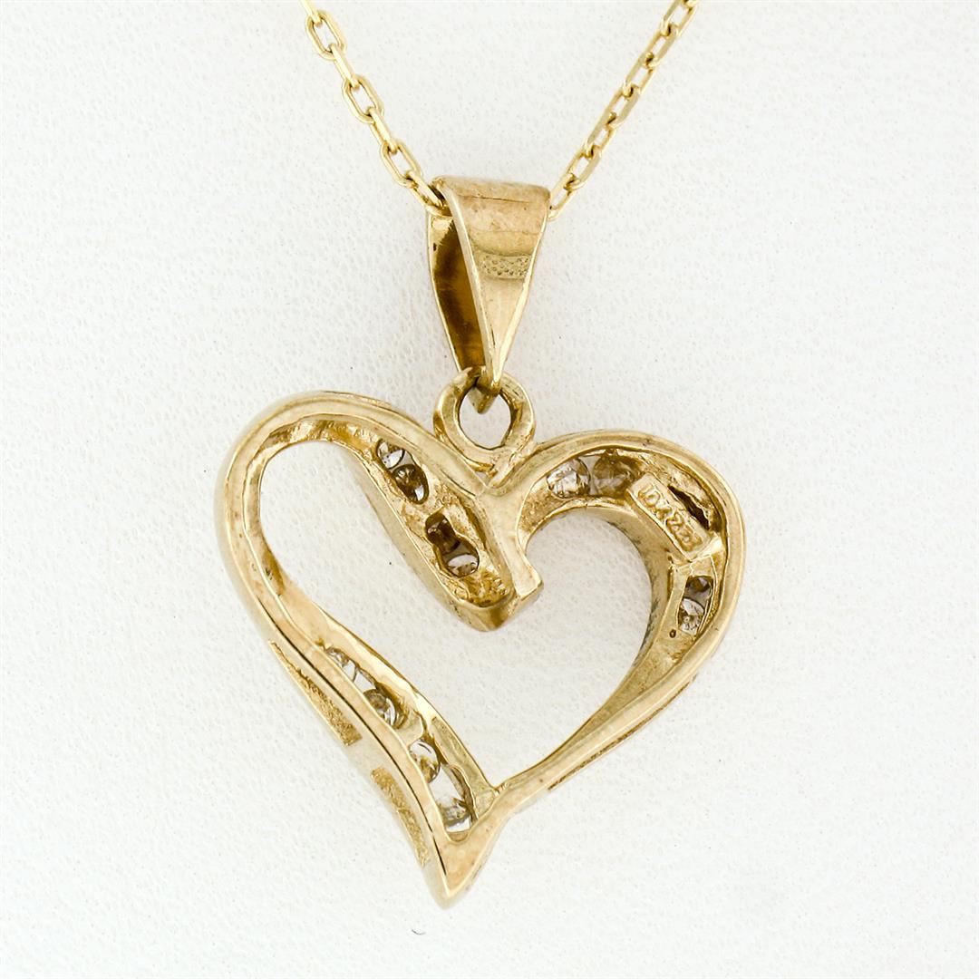 A 10k yellow gold open heart pendant necklace featuring 13 channel set round brilliant diamonds (I - I1/I2; 0.26ctw). 16 inch 14k yellow gold cable link chain, 3.75 grams total weight, pendant measures 17.8x17.8mm.