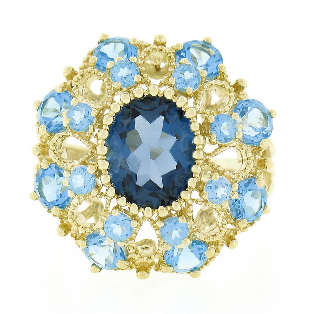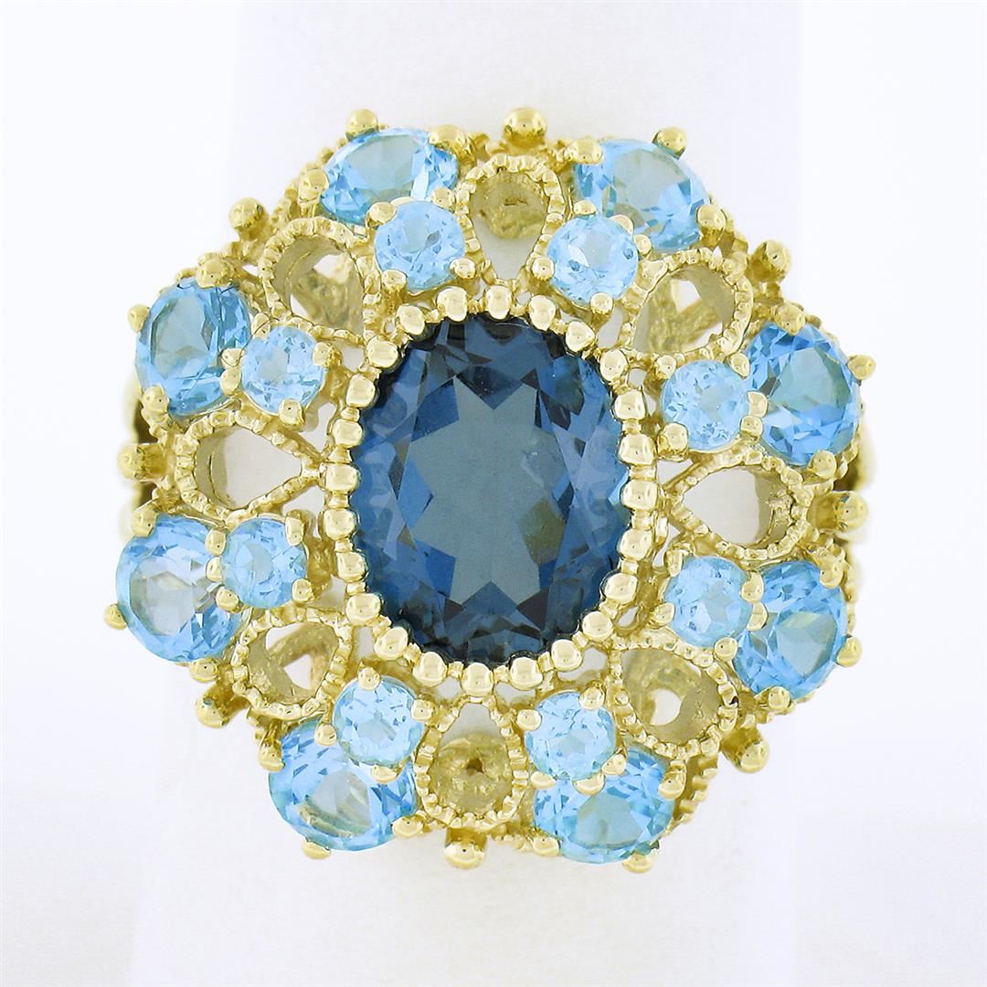 A solid 10 yellow gold tiered cluster ring, with 1 oval cut and 16 round cut blue stones.The ring is size 8.5, weighs a total of 6.36 grams, and measures 21.75mm wide.