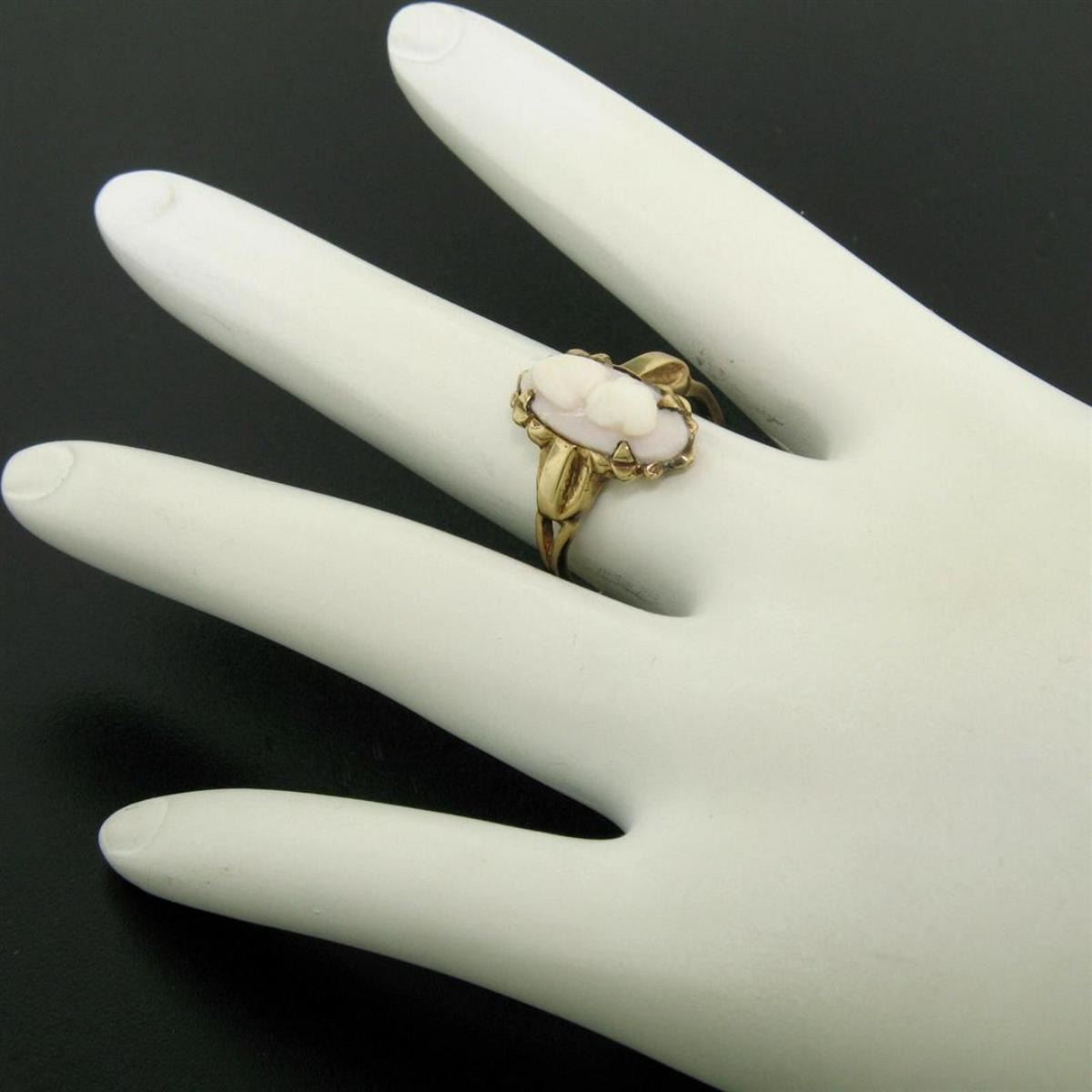 One Antique Victorian 10k Yellow Gold Simple Petite Carved Pink Stone Cameo Ring. Item Details: Material: Solid 10k Yellow Gold, Weight: 3.2 Grams, Stone(s): (1) Genuine Carved Stone Cameo - Oval Cut - Prong Set - White Carving on Pale Pink Field, Ring Size: 6.5 (We can custom size this ring.), Ring Width: 16.99mm, Ring Height: 5.84mm rise off the finger, Condition: Antique, Victorian era piece. Cameo appears to have been repaired at one point. Great overall condition and 100% ready to wear.