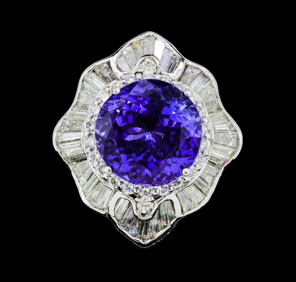 One electronically tested 18KT white gold lady's cast fashion ring with a scalloped basket halo with a bright polish finish. The featured lady's ring has a shank measuring 3.97 millimeters wide. Identified with markings of '18K'. Condition is new, good workmanship. Containing: One prong set round modified brilliant cut natural tanzanite, measuring 12.84 - 12.82 x 9.28 mm, (depth est.) 7%. bulge factor, approximate weight of 11.01ct., clarity is eye clean, medium dark, strong, violetish blue color, (GIA vB 6/5), cut is very good. Transmitting light with no distortion, transparent. Colored gemstones are presumed to have been subjected to commonly used enhancement processes. Graded in the setting. Forty-Two channel set baguette cut (tapered) diamonds, measuring from 3.00 x 1.20 x 1.02mm (depth est.) to 3.80 x 1.60 x 1.36mm (depth est.) approximate total weight of 42 Stones = 2.52ct. Graded in the setting. Color H - I Clarity VS-2 to SI-1 Cut Very Good Twenty-Four prong set round brilliant cut diamonds, measuring 1.90 - 1.80 x 1.15mm (depth est.) approximate total weight of 24 Stones = 0.58ct. Graded in the setting. Color H - I Clarity SI-1 to SI-2 Cut Good. Total Weight of Colored Stones 11.01ct.. Total Weight of Diamonds 3.10ct.. Total Weight of Ring 14.10gm GAS Appraised at $27130.00. GAS Appraised at $27,130.00.