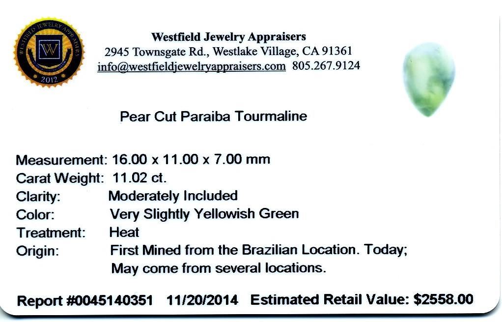 11.02ct. Pear Cabochon Cut Paraiba Tourmaline Westfield Appraised at $2,558.00.