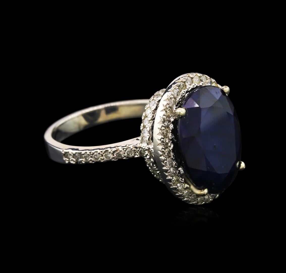 One electronically tested white gold ladies cast sapphire and diamond ring with a bright polish finish. Condition is new, good workmanship. The featured sapphire is set within a diamond bezel supported by a diamond set under gallery and diamond set shoulders, completed by a two and one-half millimeter wide band. Containing: One prong set oval mixed cut natural blue sapphire, measuring 14.40 x 11.50 x 7.25mm, 12% bulge factor, approximate weight of 11.03ct., type II, dark, very slightly grayish, violetish blue color, (GIA vB 7/3), cut is good. Transmitting light very diffusely, opaque. Naturally occurring internal & external characteristics are present. Indications of multiple laboratory enhancements, including high temperature diffusion treatment. Graded in the setting. Seventy-four prong set round brilliant cut diamonds, measuring 1.40 - 1.30 x 0.81mm (depth est.) approximate total weight of 74 Stones = 0.73ct. Graded in the setting. Clarity: I-1 to I-2.Color: J - L. AIG Appraised at $3,970.00.