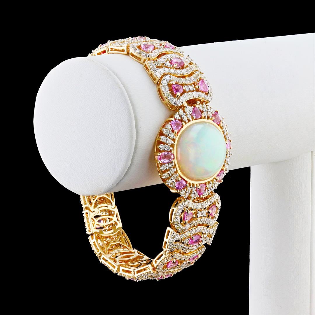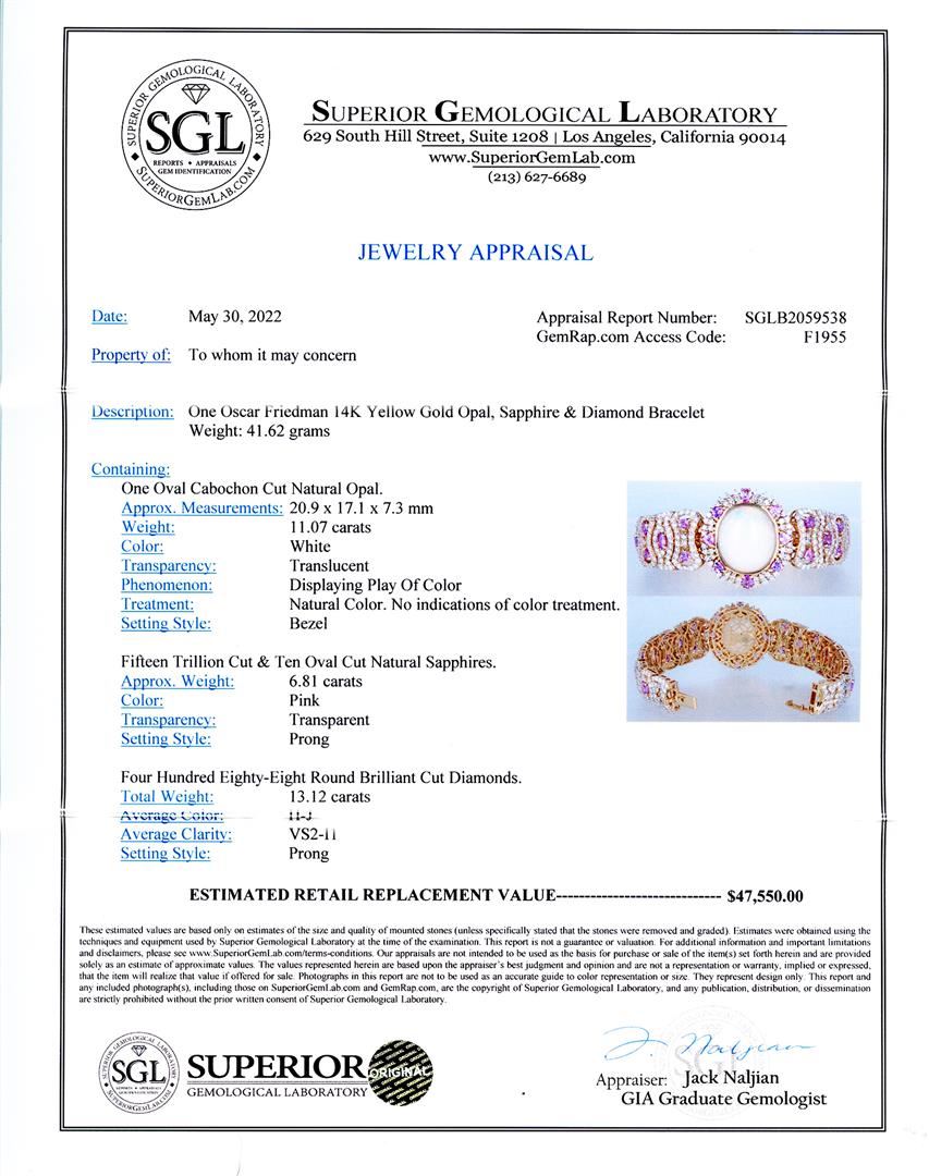 11.07ct Opal, 6.81ctw Pink Sapphire and 13.12ctw Diamond 14K Yellow Gold Bracelet. Description: One Oscar Friedman 14K Yellow Gold Opal, Sapphire and Diamond Bracelet Weight: 41.62 grams Containing: One Oval Cabochon Cut Natural Opal. Approx. Measurements: 20.9 x 17.1 x 7.3mm Weight: 11.07 carats Color: White Transparency: Translucent Phenomenon: Displaying Play Of Color Treatment: Natural Color. No indications of color treatment Setting Style: Bezel Fifteen Trillion Cut and Ten Oval Cut Natural Sapphires. Approx. Weight: 6.81 carats Color: Pink Transparency: Transparent Setting Style: Prong Four Hundred Eighty-Eight Round Brilliant Cut Diamonds. Total Weight: 13.12 carats Average Color: H-J Average Clarity: VS2-I1 Setting Style: Prong