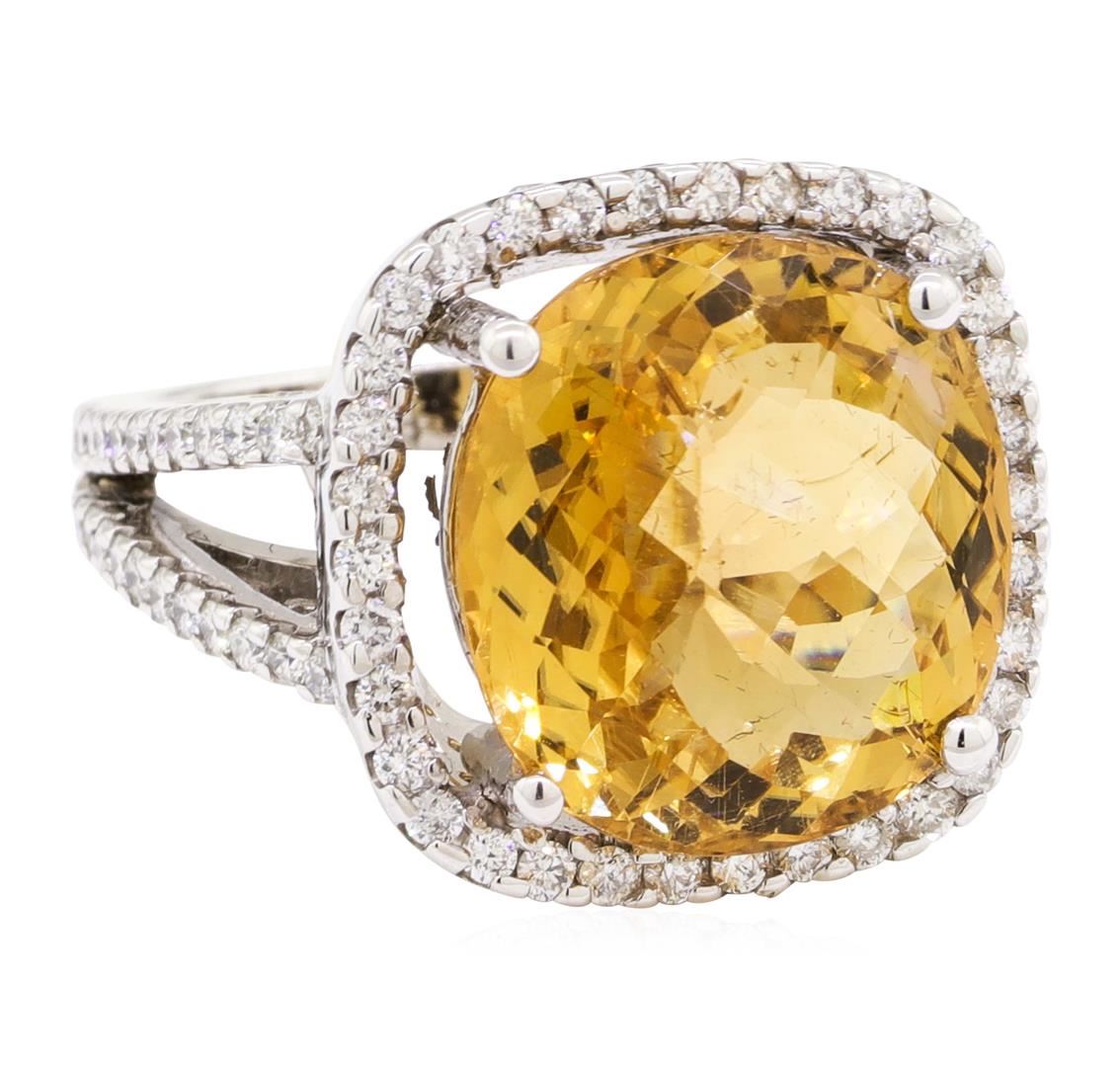 One electronically tested 14KT white gold lady's cast fashion ring with a split shank cushion basket halo with a bright polish finish. The featured lady's ring has a double European shank measuring 2.92 millimeters wide. Identified with markings of '14K'. Condition is new, good workmanship. Containing: One prong set square cushion modified mixed cut natural golden tourmaline, measuring 14.50 x 13.41 x 7.65mm, (depth est.) approximate weight of 9.97ct., clarity is eye clean, medium, brownish, yellowish orange color, (GIA yO 5/3), cut is excellent. The featured golden tourmaline is cut with a checkerboard top. Transmitting light with no distortion, transparent. Colored gemstones are presumed to have been subjected to commonly used enhancement processes. Graded in the setting. Fourteen bezel set round brilliant cut diamonds, measuring 1.70 - 1.50 x 0.99mm (depth est.) approximate total weight of 14 Stones = 0.22ct. Graded in the setting. Color G - H Clarity SI-1 to SI-2 Cut Good Eighty-Two prong set round brilliant cut diamonds, measuring 1.50 - 1.40 x 0.87mm (depth est.) approximate total weight of 82 Stones = 0.89ct. Graded in the setting. Color G - H Clarity SI-1 to SI-2 Cut Good. Total Weight of Colored Stones 9.97ct.. Total Weight of Diamonds 1.11ct.. Total Weight of Ring 11.80gm GAS Appraised at $9325.00. GAS Appraised.