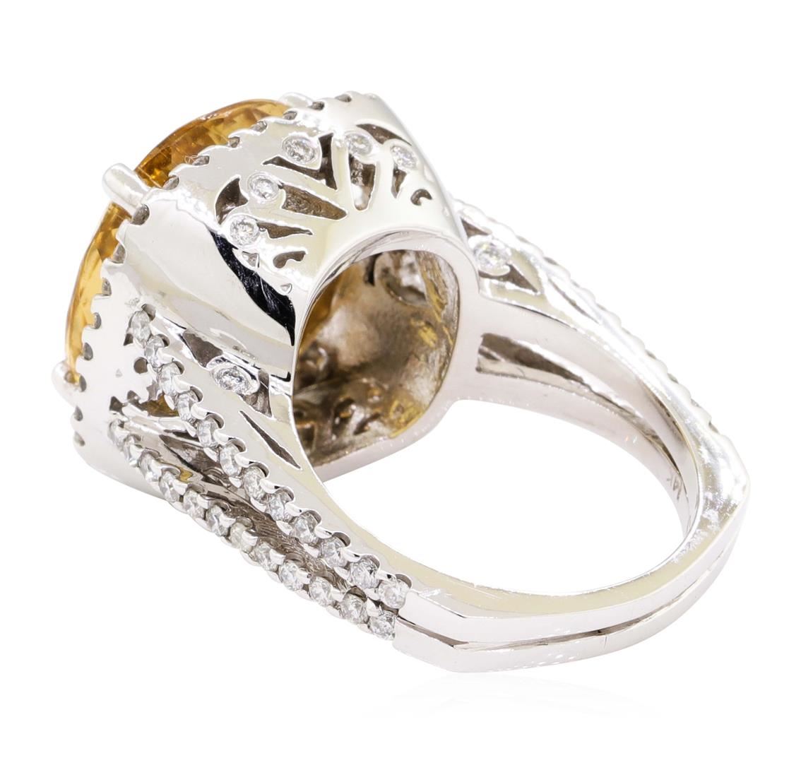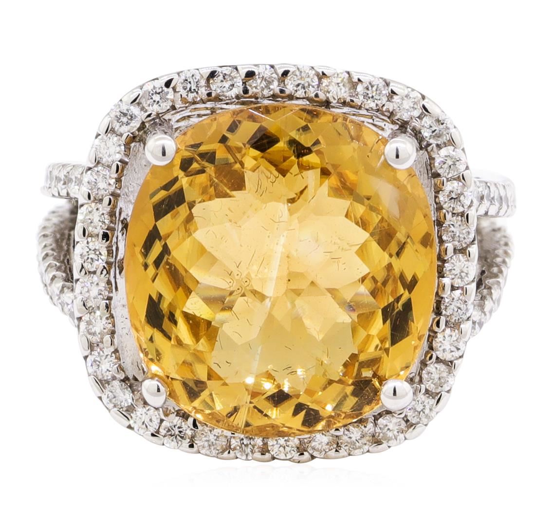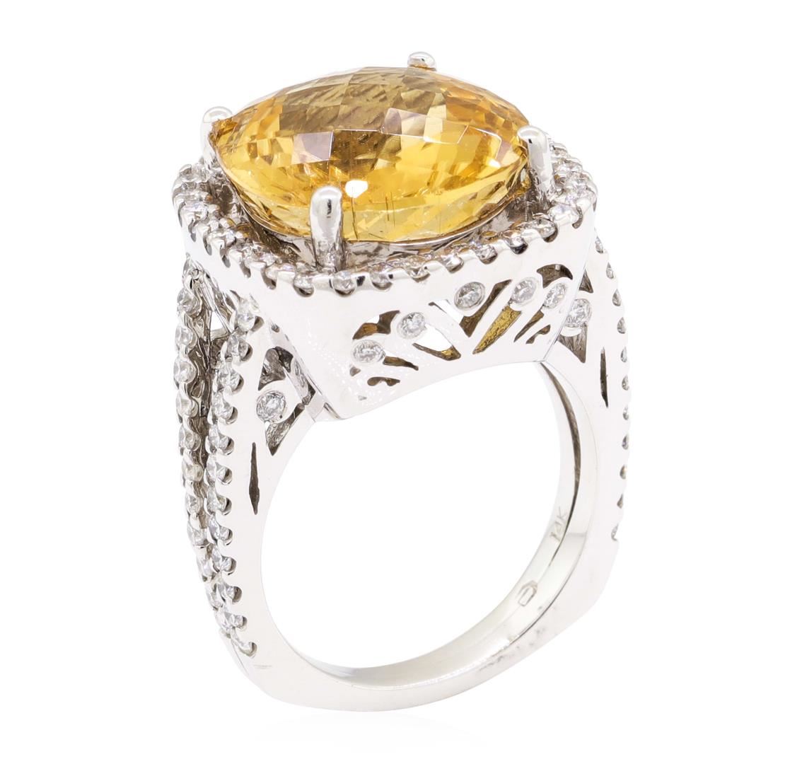 One electronically tested 14KT white gold lady's cast fashion ring with a split shank cushion basket halo with a bright polish finish. The featured lady's ring has a double European shank measuring 2.92 millimeters wide. Identified with markings of '14K'. Condition is new, good workmanship. Containing: One prong set square cushion modified mixed cut natural golden tourmaline, measuring 14.50 x 13.41 x 7.65mm, (depth est.) approximate weight of 9.97ct., clarity is eye clean, medium, brownish, yellowish orange color, (GIA yO 5/3), cut is excellent. The featured golden tourmaline is cut with a checkerboard top. Transmitting light with no distortion, transparent. Colored gemstones are presumed to have been subjected to commonly used enhancement processes. Graded in the setting. Fourteen bezel set round brilliant cut diamonds, measuring 1.70 - 1.50 x 0.99mm (depth est.) approximate total weight of 14 Stones = 0.22ct. Graded in the setting. Color G - H Clarity SI-1 to SI-2 Cut Good Eighty-Two prong set round brilliant cut diamonds, measuring 1.50 - 1.40 x 0.87mm (depth est.) approximate total weight of 82 Stones = 0.89ct. Graded in the setting. Color G - H Clarity SI-1 to SI-2 Cut Good. Total Weight of Colored Stones 9.97ct.. Total Weight of Diamonds 1.11ct.. Total Weight of Ring 11.80gm GAS Appraised at $9325.00. GAS Appraised.