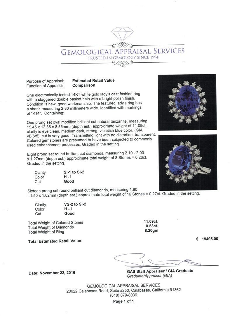 One electronically tested 14KT white gold lady's cast fashion ring with a staggered double basket halo with a bright polish finish. The featured lady's ring has a shank measuring 2.80 millimeters wide. Identified with markings of 'K14'. Condition is new, good workmanship. Containing: One prong set oval modified brilliant cut natural tanzanite, measuring 15.45 x 12.35 x 8.55mm, (depth est.) approximate weight of 11.09ct., clarity is eye clean, medium dark, strong, violetish blue color, (GIA vB 6/5), cut is very good. Transmitting light with no distortion, transparent. Colored gemstones are presumed to have been subjected to commonly used enhancement processes. Graded in the setting. Eight prong set round brilliant cut diamonds, measuring 2.10 - 2.00 x 1.27mm (depth est.) approximate total weight of 8 Stones = 0.26ct. Graded in the setting. Clarity SI-1 to SI-2. Color: H - I Cut Good Sixteen prong set round brilliant cut diamonds, measuring 1.80 - 1.50 x 1.02mm (depth est.) approximate total weight of 16 Stones = 0.27ct. Graded in the setting. Clarity VS-2 to SI-2. Color: H - I Cut Good. Total Weight of Colored Stones 11.09ct.. Total Weight of Diamonds 0.53ct.. Total Weight of Ring 8.20gm. GAS Appraised.