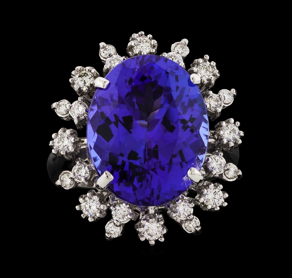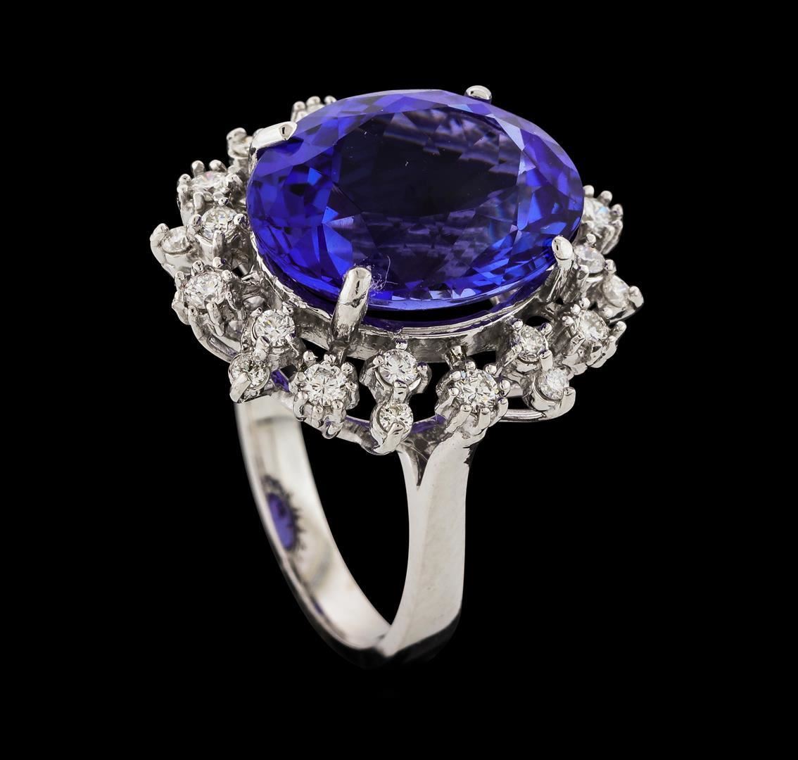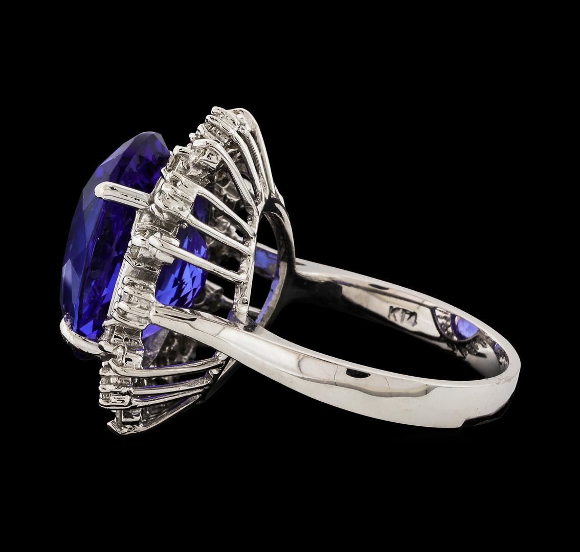 One electronically tested 14KT white gold lady's cast fashion ring with a staggered double basket halo with a bright polish finish. The featured lady's ring has a shank measuring 2.80 millimeters wide. Identified with markings of 'K14'. Condition is new, good workmanship. Containing: One prong set oval modified brilliant cut natural tanzanite, measuring 15.45 x 12.35 x 8.55mm, (depth est.) approximate weight of 11.09ct., clarity is eye clean, medium dark, strong, violetish blue color, (GIA vB 6/5), cut is very good. Transmitting light with no distortion, transparent. Colored gemstones are presumed to have been subjected to commonly used enhancement processes. Graded in the setting. Eight prong set round brilliant cut diamonds, measuring 2.10 - 2.00 x 1.27mm (depth est.) approximate total weight of 8 Stones = 0.26ct. Graded in the setting. Clarity SI-1 to SI-2. Color: H - I Cut Good Sixteen prong set round brilliant cut diamonds, measuring 1.80 - 1.50 x 1.02mm (depth est.) approximate total weight of 16 Stones = 0.27ct. Graded in the setting. Clarity VS-2 to SI-2. Color: H - I Cut Good. Total Weight of Colored Stones 11.09ct.. Total Weight of Diamonds 0.53ct.. Total Weight of Ring 8.20gm. GAS Appraised.
