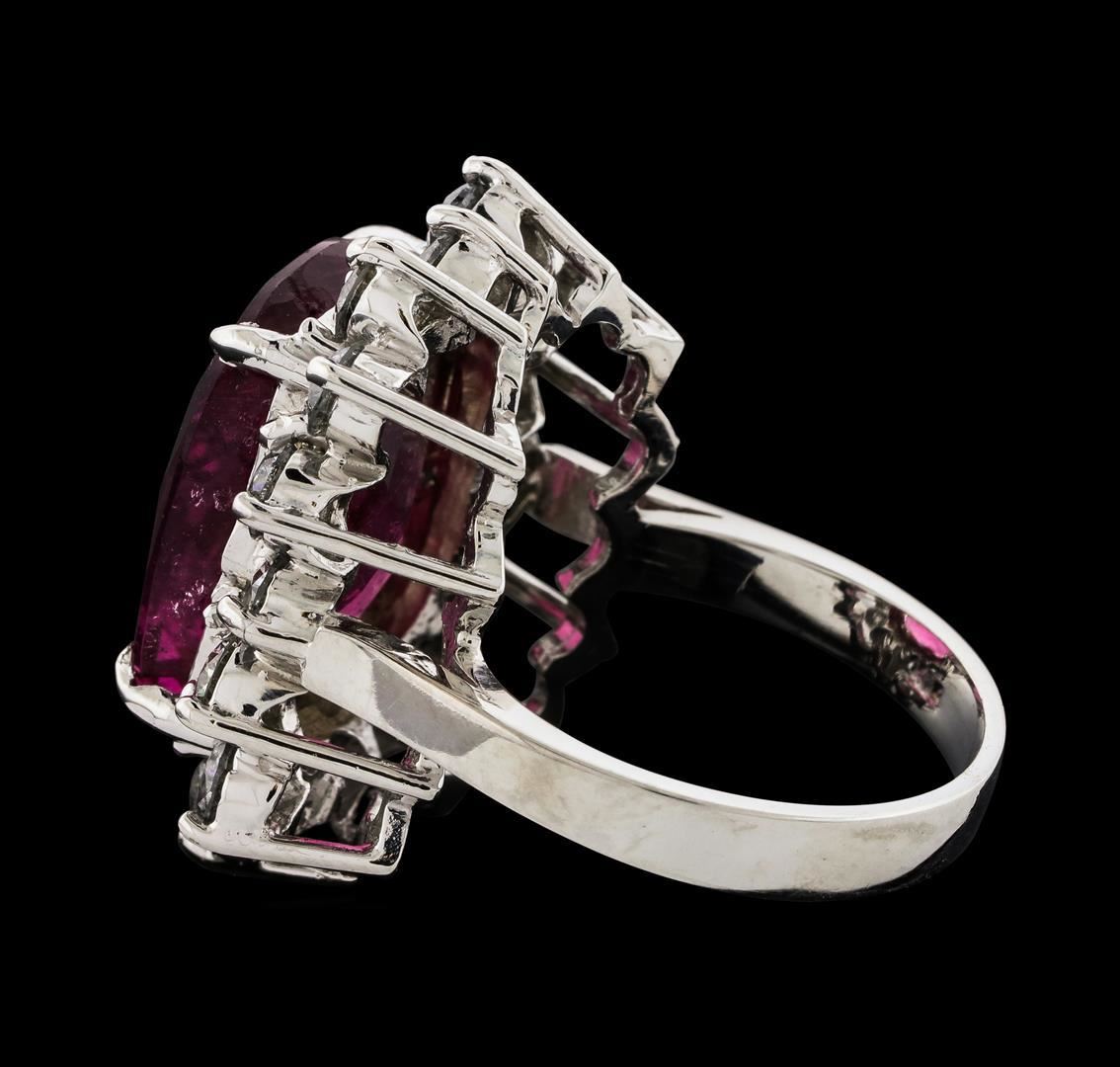 One 14KT White Gold "One of a Kind" Lady's Ring, 11.40 grams. Containing: Main Gemstones: Identity: Natural Tourmaline. Carat Weight: 11.12 cts tw. Shape & Measurement: Cushion Checker Cut. Quality: Fine color and cutting. Adjacent Gemstones: Identity: Natural Diamonds. Shape: Round Brilliant Cut. Carat Weight: 2.37 cts tw. Quality: SI Clarity, G-H Color. All fine cutting and proportions. Total Gemstones Weight: 13.49 cts tw. RBGS Appraised.