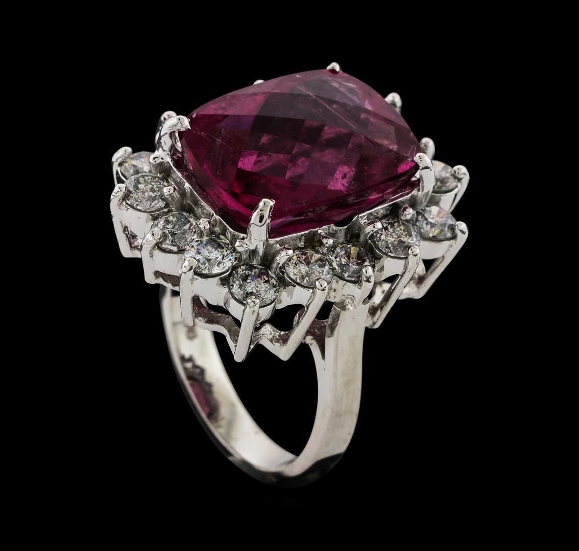 One 14KT White Gold "One of a Kind" Lady's Ring, 11.40 grams. Containing: Main Gemstones: Identity: Natural Tourmaline. Carat Weight: 11.12 cts tw. Shape & Measurement: Cushion Checker Cut. Quality: Fine color and cutting. Adjacent Gemstones: Identity: Natural Diamonds. Shape: Round Brilliant Cut. Carat Weight: 2.37 cts tw. Quality: SI Clarity, G-H Color. All fine cutting and proportions. Total Gemstones Weight: 13.49 cts tw. RBGS Appraised.