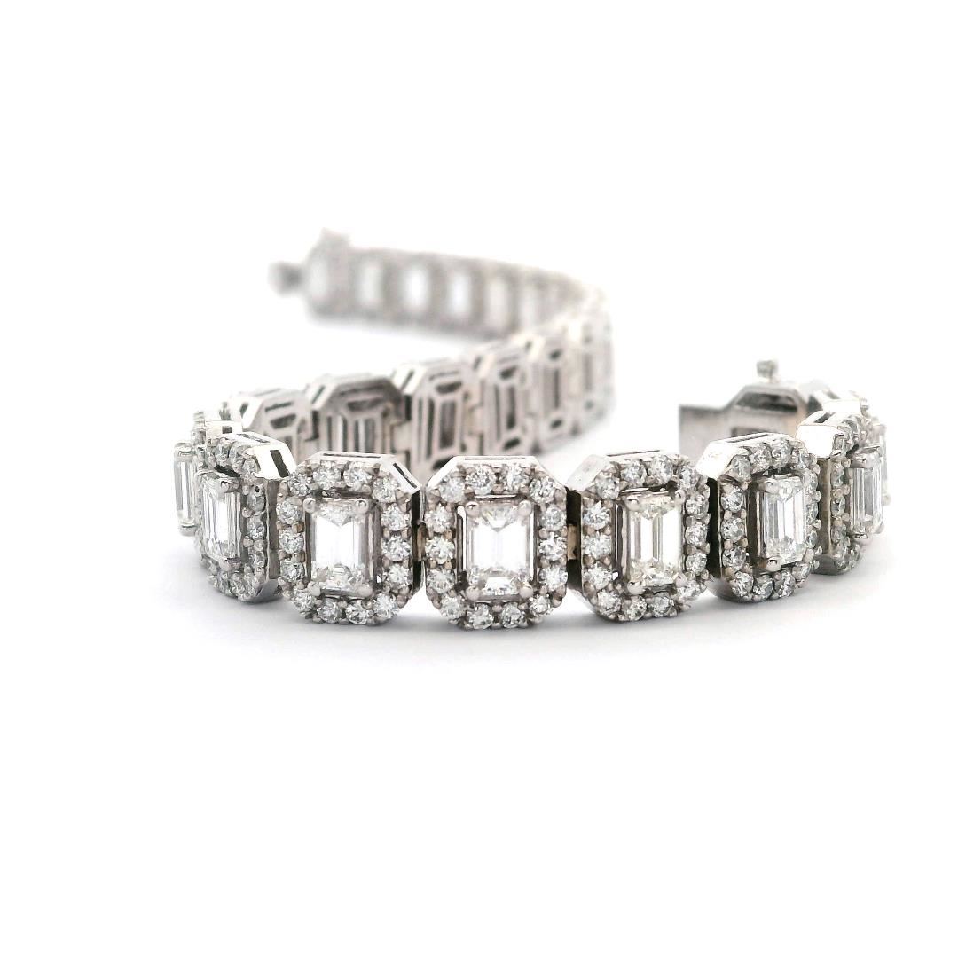 This bracelet features 25 emerald cut diamonds totaling 6.15ct with VS-1 to VS-2 clarity and G-H color, surrounded by 350 round brilliant diamonds totaling 5.00ct. A stunning tennis bracelet design! One electronically tested 14KT white gold lady's combination cast & assembled diamond tennis bracelet with a tongue clasp & fold over safety with an emerald cut motif with a bright polish finish. Condition is new, good workmanship. The featured lady's bracelet measures 7 inches in length. Identified with markings of 14K. Containing: Twenty-five prong set emerald cut diamonds, measuring 4.32 x 2.98 x 1.98mm (depth est.), approximate total weight of 25 Stones = 6.15ct. Graded in the setting. Color: G-H Clarity: VS-1 to VS-2 Cut: Excellent Three hundred fifty prong set round brilliant cut diamonds, measuring 1.60 - 1.55 x 0.95mm (depth est.), approximate total weight of 350 Stones = 5.00ct. Graded in the setting. Color: G-I Clarity: VS-1 to SI-1 Cut: Very Good Total Weight of Diamonds: 11.15ct. Total Weight of Tennis Bracelet: 24.60gm Total Estimated Retail Value: $52500.00 Appraisal No: 000024088010