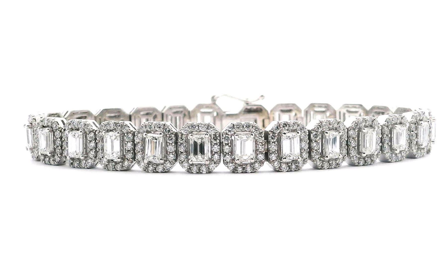 This bracelet features 25 emerald cut diamonds totaling 6.15ct with VS-1 to VS-2 clarity and G-H color, surrounded by 350 round brilliant diamonds totaling 5.00ct. A stunning tennis bracelet design! One electronically tested 14KT white gold lady's combination cast & assembled diamond tennis bracelet with a tongue clasp & fold over safety with an emerald cut motif with a bright polish finish. Condition is new, good workmanship. The featured lady's bracelet measures 7 inches in length. Identified with markings of 14K. Containing: Twenty-five prong set emerald cut diamonds, measuring 4.32 x 2.98 x 1.98mm (depth est.), approximate total weight of 25 Stones = 6.15ct. Graded in the setting. Color: G-H Clarity: VS-1 to VS-2 Cut: Excellent Three hundred fifty prong set round brilliant cut diamonds, measuring 1.60 - 1.55 x 0.95mm (depth est.), approximate total weight of 350 Stones = 5.00ct. Graded in the setting. Color: G-I Clarity: VS-1 to SI-1 Cut: Very Good Total Weight of Diamonds: 11.15ct. Total Weight of Tennis Bracelet: 24.60gm Total Estimated Retail Value: $52500.00 Appraisal No: 000024088010