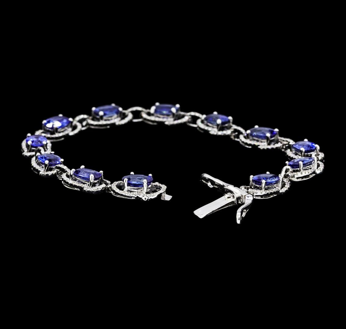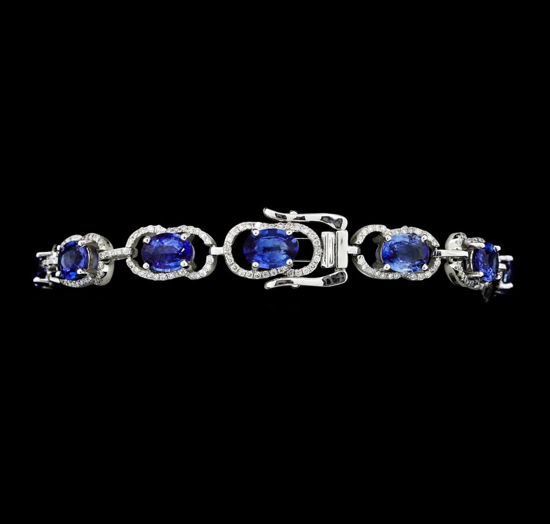 One electronically tested 14KT white gold lady's combination cast & assembled fashion bracelet with a tongue clasp with double foldover safeties with a bright polish finish. The featured lady's bracelet measures approximately 6.75 inches in length. Identified with markings of '14K'. Condition is new, good workmanship. Containing: Twelve prong set oval modified mixed cut natural blue sapphires, measuring 6.95 x 5.02 x 3.15mm, (depth est.) approximate total weight of 11.15ct., clarity is eye clean, medium light, moderately strong, blue color, (GIA B 4/4), cut is good. Transmitting light with no distortion, transparent. Colored gemstones are presumed to have been subjected to commonly used enhancement processes. Graded in the setting. Three Hundred Fifty-Two prong set round brilliant cut diamonds, measuring 1.05 - 0.95 x 0.62mm (depth est.) approximate total weight of 352 Stones = 1.31ct. Graded in the setting. Color G - H Clarity VS-2 to SI-1 Cut Very Good. Total Weight of Colored Stones 11.15ct.. Total Weight of Diamonds 1.31ct.. Total Weight of Bracelet 13.10gm GAS Appraised at $18835.00. GAS Appraised at $18,835.00.