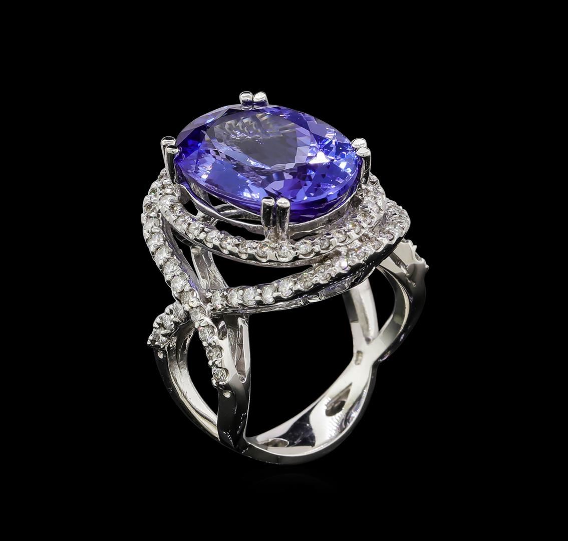 One electronically tested 14KT white gold lady's cast fashion ring with a crossover split shank with a bright polish finish. The featured lady's ring has a double halo and a double shank measuring 5.20 millimeters wide. Identified with markings of 'K14'. Condition is new, good workmanship. Containing: One prong set oval modified brilliant cut natural tanzanite, measuring 17.07 x 12.08 x 7.31mm, (depth est.) 5%. bulge factor, approximate weight of 11.16ct., clarity is eye clean, medium, moderately strong, violetish blue color, (GIA vB 5/4), cut is very good. Transmitting light with no distortion, transparent. Colored gemstones are presumed to have been subjected to commonly used enhancement processes. Graded in the setting. Fifty-Two prong set round brilliant cut diamonds, measuring 1.60 - 1.50 x 0.96mm (depth est.) approximate total weight of 52 Stones = 0.74ct. Graded in the setting. Clarity SI-1 to SI-2. Color: H - I Cut Good Thirty-Four prong set round brilliant cut diamonds, measuring 1.40 - 1.35 x 0.86mm (depth est.) approximate total weight of 34 Stones = 0.34ct. Graded in the setting. Clarity SI-1 to SI-2. Color: H - I Cut Good. Total Weight of Colored Stones 11.16ct.. Total Weight of Diamonds 1.08ct.. Total Weight of Ring 12.40gm GAS Appraised at $23,785.00.