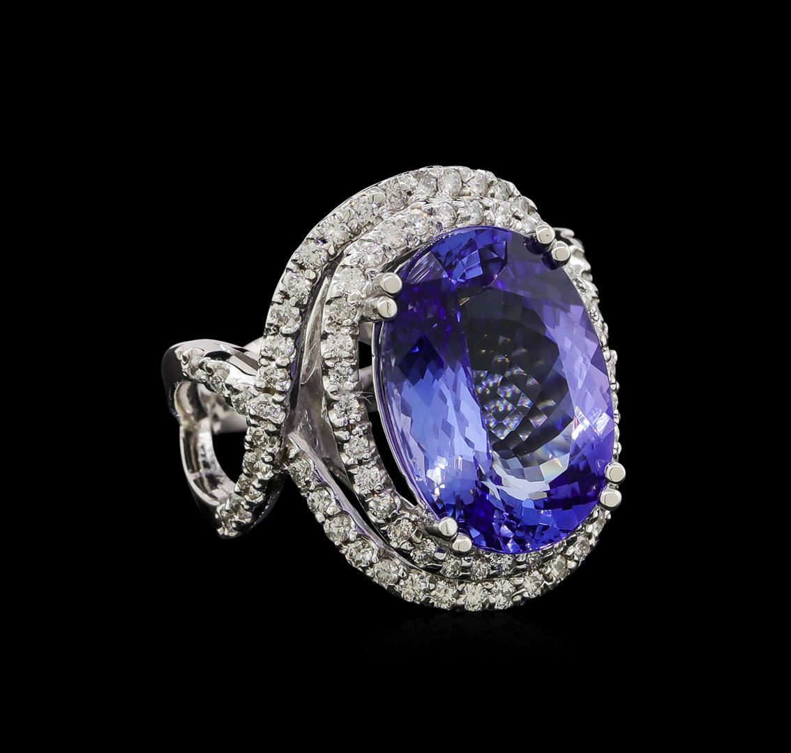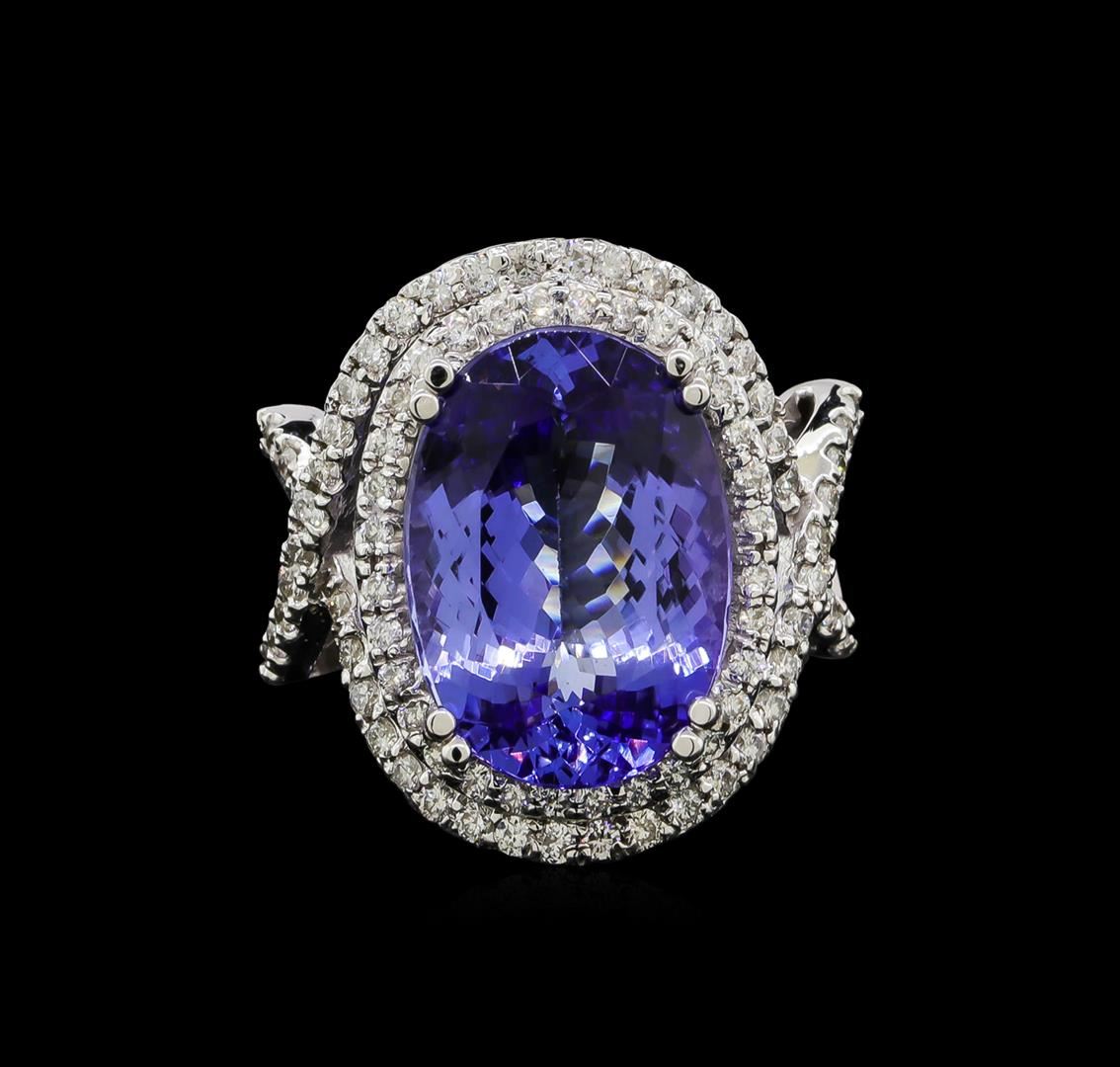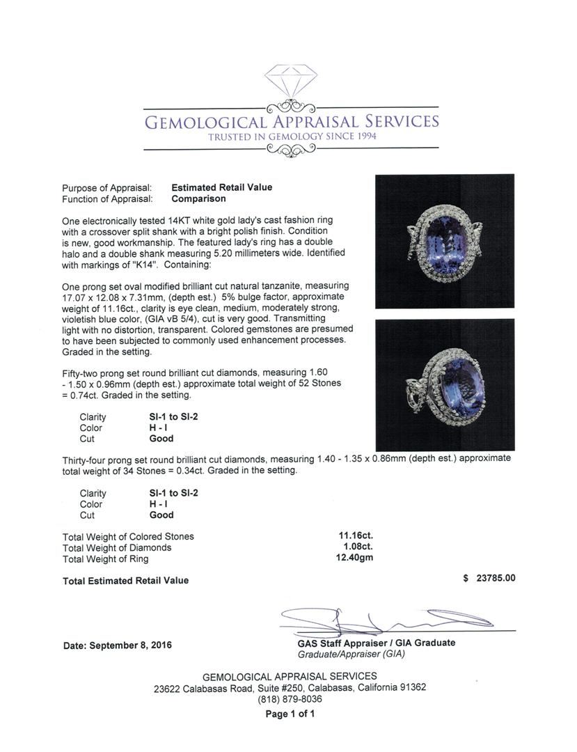 One electronically tested 14KT white gold lady's cast fashion ring with a crossover split shank with a bright polish finish. The featured lady's ring has a double halo and a double shank measuring 5.20 millimeters wide. Identified with markings of 'K14'. Condition is new, good workmanship. Containing: One prong set oval modified brilliant cut natural tanzanite, measuring 17.07 x 12.08 x 7.31mm, (depth est.) 5%. bulge factor, approximate weight of 11.16ct., clarity is eye clean, medium, moderately strong, violetish blue color, (GIA vB 5/4), cut is very good. Transmitting light with no distortion, transparent. Colored gemstones are presumed to have been subjected to commonly used enhancement processes. Graded in the setting. Fifty-Two prong set round brilliant cut diamonds, measuring 1.60 - 1.50 x 0.96mm (depth est.) approximate total weight of 52 Stones = 0.74ct. Graded in the setting. Clarity SI-1 to SI-2. Color: H - I Cut Good Thirty-Four prong set round brilliant cut diamonds, measuring 1.40 - 1.35 x 0.86mm (depth est.) approximate total weight of 34 Stones = 0.34ct. Graded in the setting. Clarity SI-1 to SI-2. Color: H - I Cut Good. Total Weight of Colored Stones 11.16ct.. Total Weight of Diamonds 1.08ct.. Total Weight of Ring 12.40gm GAS Appraised at $23,785.00.