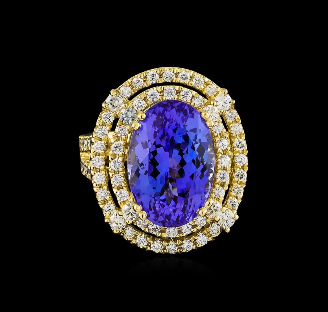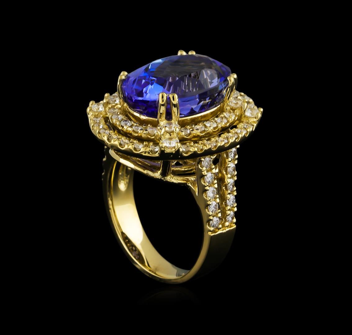 One electronically tested 14KT yellow gold ladies cast tanzanite and diamond ring with a bright polish finish. The featured tanzanite is set within tiered diamond bezels supported by an elaborate lattice under gallery and diamond set split shoulders, completed by a four millimeter wide band. Identified with markings of "K14". Condition is new, good workmanship. Containing: One prong set oval mixed cut natural tanzanite, measuring 15.80 x 10.90 x 9.20mm, approximate weight of 11.16ct., clarity is eye clean, type I, medium dark, very slightly grayish, bluish violet color, (GIA bV 6/3), cut is good. Transmitting light with no distortion, transparent. Colored Stone Grading Report attached. Graded in the setting. Tanzanite is a very rare gemstone that is only found in the country of Tanzania. Originally discovered in 1967. Tiffany & Company, named the stone Tanzanite. It is found in the Usumburu Mountains that border the Umba Valley of northern Tanzania. Tanzanite occurs in gray, brown, violet, blue, reddish-purple, & green. The gem is interesting because of its exceptional pleochroism. Rotated in different directions a tanzanite will exhibit multiple changes of color. Tanzanite has a low tolerance to ultrasonic cleaning, and should not be cleaned using this method. Eight prong set round brilliant cut diamonds, measuring 2.10 - 2.10 x 1.26mm (depth est.) approximate total weight of 8 Stones = 0.27ct. Graded in the setting. Clarity: SI-2 to I-2. Color: G - I Sixty-Eight prong set round brilliant cut diamonds, measuring 1.70 - 1.70 x 1.02mm (depth est.) approximate total weight of 68 Stones = 1.22ct. Graded in the setting. Clarity: SI-2 to I-2. Color: G - I. Total Weight of Colored Stones 11.16ct. Total Weight of Diamonds 1.49ct. Total Weight of Ring 13.82gm. AIG Appraised at $30,840.00.