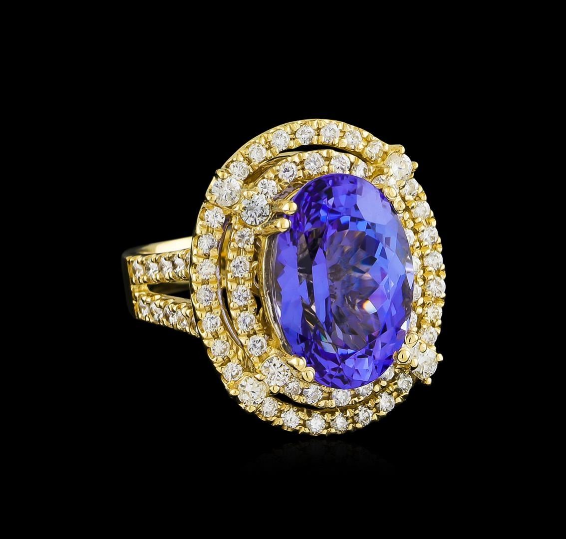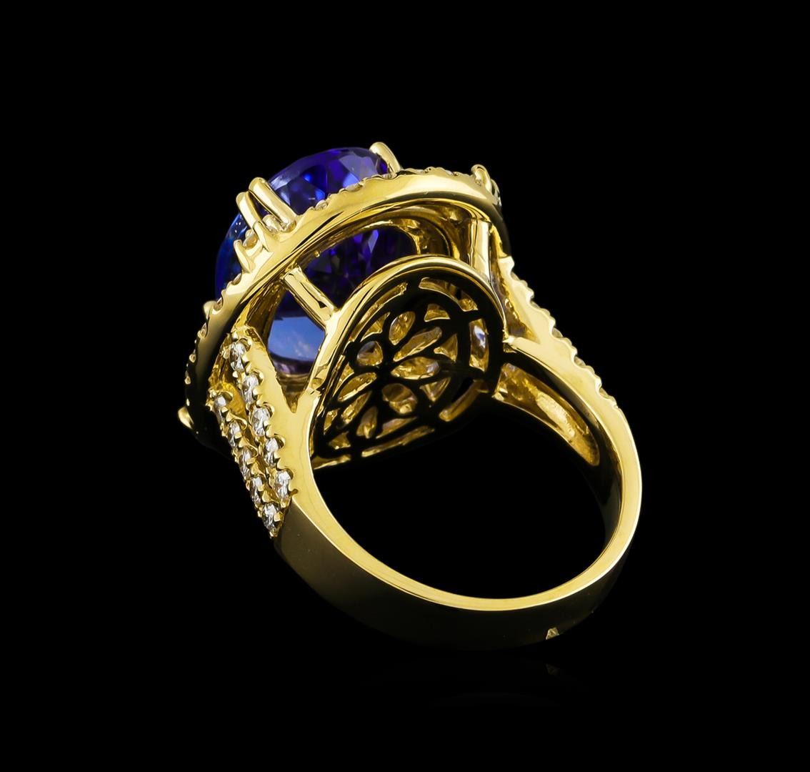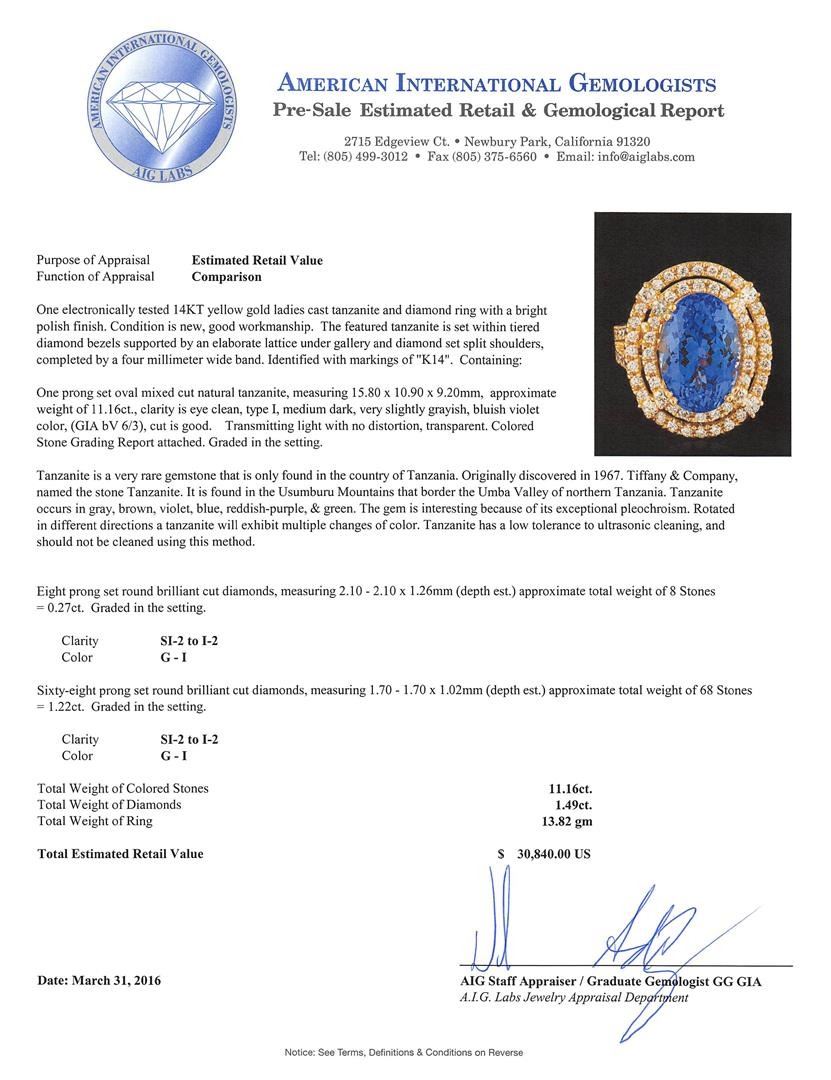 One electronically tested 14KT yellow gold ladies cast tanzanite and diamond ring with a bright polish finish. The featured tanzanite is set within tiered diamond bezels supported by an elaborate lattice under gallery and diamond set split shoulders, completed by a four millimeter wide band. Identified with markings of "K14". Condition is new, good workmanship. Containing: One prong set oval mixed cut natural tanzanite, measuring 15.80 x 10.90 x 9.20mm, approximate weight of 11.16ct., clarity is eye clean, type I, medium dark, very slightly grayish, bluish violet color, (GIA bV 6/3), cut is good. Transmitting light with no distortion, transparent. Colored Stone Grading Report attached. Graded in the setting. Tanzanite is a very rare gemstone that is only found in the country of Tanzania. Originally discovered in 1967. Tiffany & Company, named the stone Tanzanite. It is found in the Usumburu Mountains that border the Umba Valley of northern Tanzania. Tanzanite occurs in gray, brown, violet, blue, reddish-purple, & green. The gem is interesting because of its exceptional pleochroism. Rotated in different directions a tanzanite will exhibit multiple changes of color. Tanzanite has a low tolerance to ultrasonic cleaning, and should not be cleaned using this method. Eight prong set round brilliant cut diamonds, measuring 2.10 - 2.10 x 1.26mm (depth est.) approximate total weight of 8 Stones = 0.27ct. Graded in the setting. Clarity: SI-2 to I-2. Color: G - I Sixty-Eight prong set round brilliant cut diamonds, measuring 1.70 - 1.70 x 1.02mm (depth est.) approximate total weight of 68 Stones = 1.22ct. Graded in the setting. Clarity: SI-2 to I-2. Color: G - I. Total Weight of Colored Stones 11.16ct. Total Weight of Diamonds 1.49ct. Total Weight of Ring 13.82gm. AIG Appraised at $30,840.00.