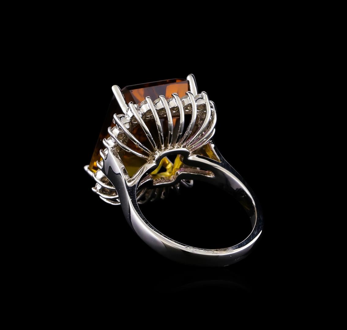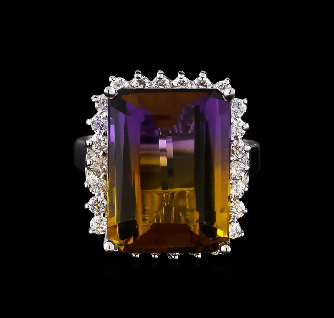 One electronically tested 14KT white gold lady's cast fashion ring with a basket halo with a bright polish finish. The featured lady's ring has a shank measuring 2.76 millimeters in width. Identified with markings of "14K". Condition is new, good workmanship. Containing: One prong set emerald step cut natural ametrine quartz, measuring 16.25 x 12.24 x 7.63mm, (depth est.) 2%. bulge factor, approximate weight of 11.18ct., clarity is eye clean, medium, moderately strong, purple color, (GIA P 5/4) to medium, moderately strong, yellowish orange, (GIA yO 5/4), cut is very good. Transmitting light with no distortion, transparent. Colored gemstones are presumed to have been subjected to commonly used enhancement processes. Graded in the setting. Twenty-Six prong set round brilliant cut diamonds, measuring 2.00 - 1.90 x 1.21mm (depth est.) approximate total weight of 26 Stones = 0.72ct. Graded in the setting. Clarity: SI-1 to SI-2. Color: H - I. Cut Good. Total Weight of Colored Stones 11.18ct. Total Weight of Diamonds 0.72ct. Total Weight of Ring 8.40gm. GAS Appraised at $3,390.00.