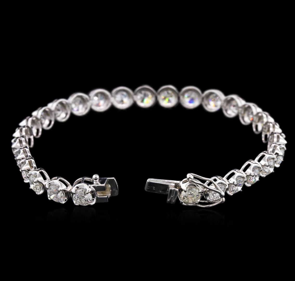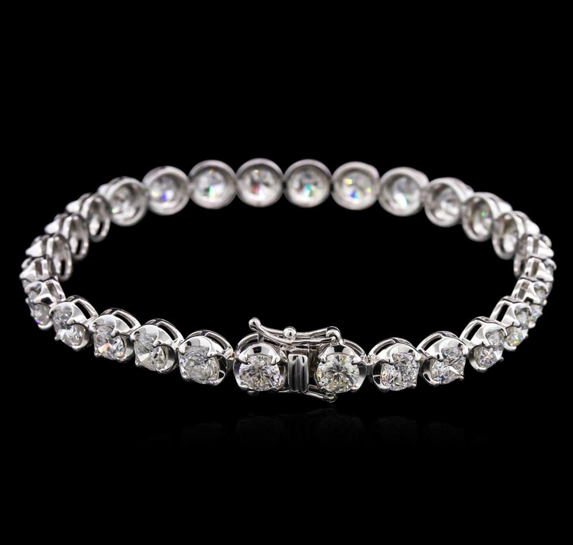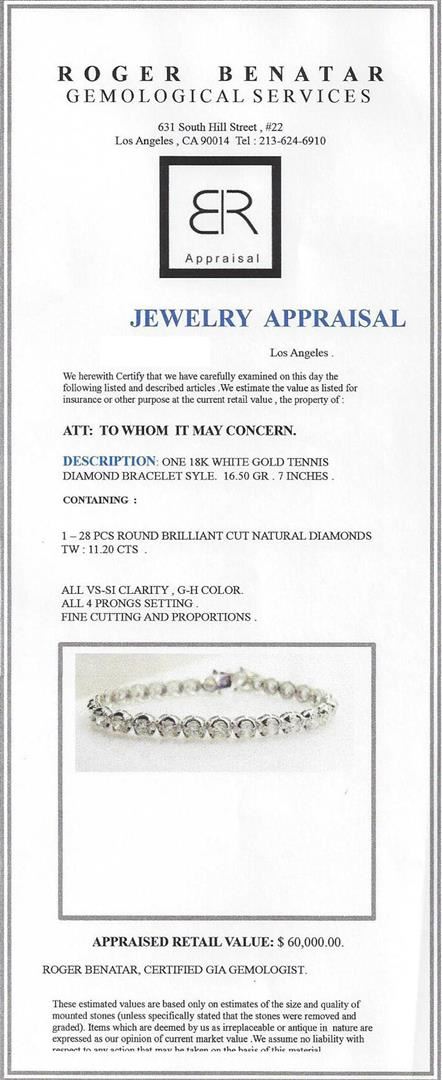 One 18K white gold tennis diamond bracelet style. 16.50 gr. 7 inches. Containing: 28 pcs round brilliant cut natural diamonds TW: 11.20 cts. All VS-SI clarity, G-H color. All 4 prongs setting. Fine cutting and proportions. RBGS Appraised at $60,000.00.