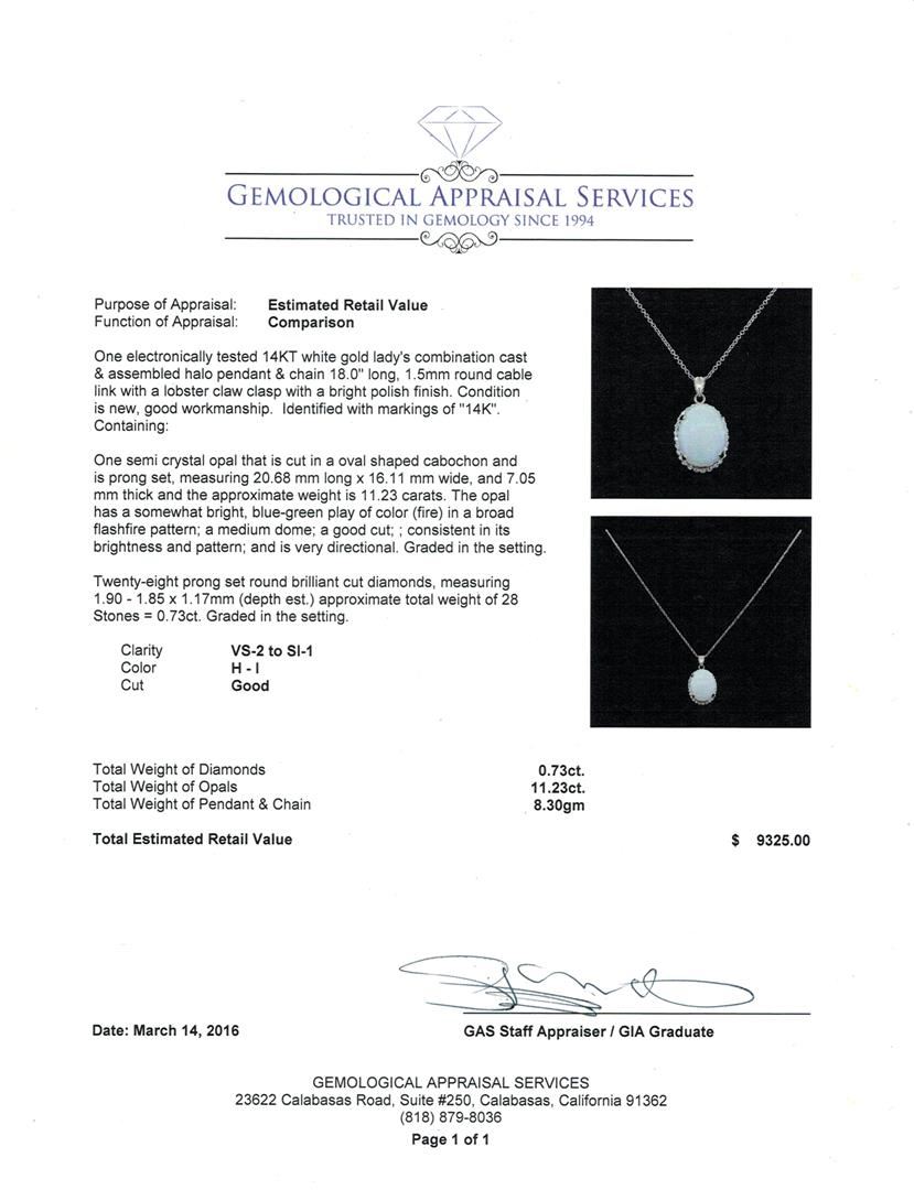 One electronically tested 14KT white gold lady's combination cast & assembled halo pendant & chain 18.0" long, 1.5mm round cable link with a lobster claw clasp with a bright polish finish. Identified with markings of "14K". Condition is new, good workmanship. Containing: One semi crystal opal that is cut in a oval shaped cabochon and is prong set, measuring 20.68 mm long x 16.11 mm wide, and 7.05 mm thick and the approximate weight is 11.23 carats. The opal has a somewhat bright, blue-green play of color (fire) in a broad flashfire pattern; a medium dome; a good cut; ; consistent in its brightness and pattern; and is very directional. Graded in the setting. Twenty-Eight prong set round brilliant cut diamonds, measuring 1.90 - 1.85 x 1.17mm (depth est.) approximate total weight of 28 Stones = 0.73ct. Graded in the setting. Clarity: VS-2 to SI-1. Color: H - I. Cut Good. Total Weight of Diamonds 0.73ct. Total Weight of Opals 11.23ct. Total Weight of Pendant & Chain 8.30gm. GAS Appraised at $9,325.00.