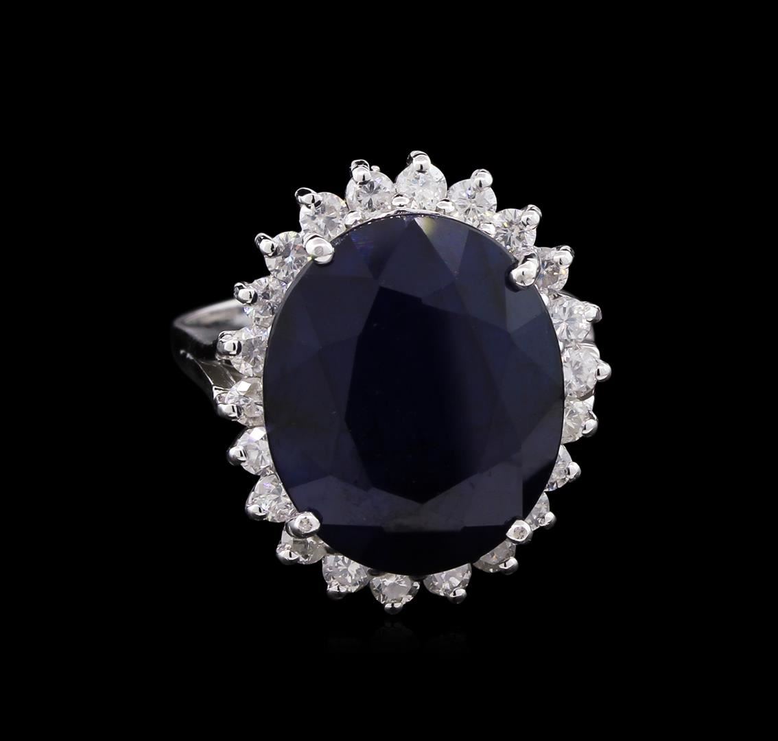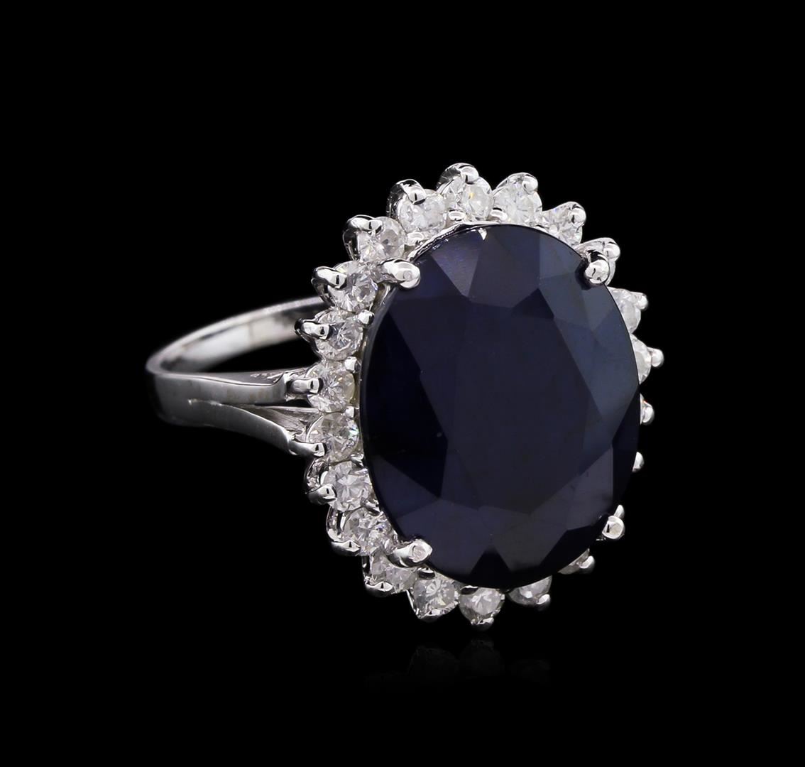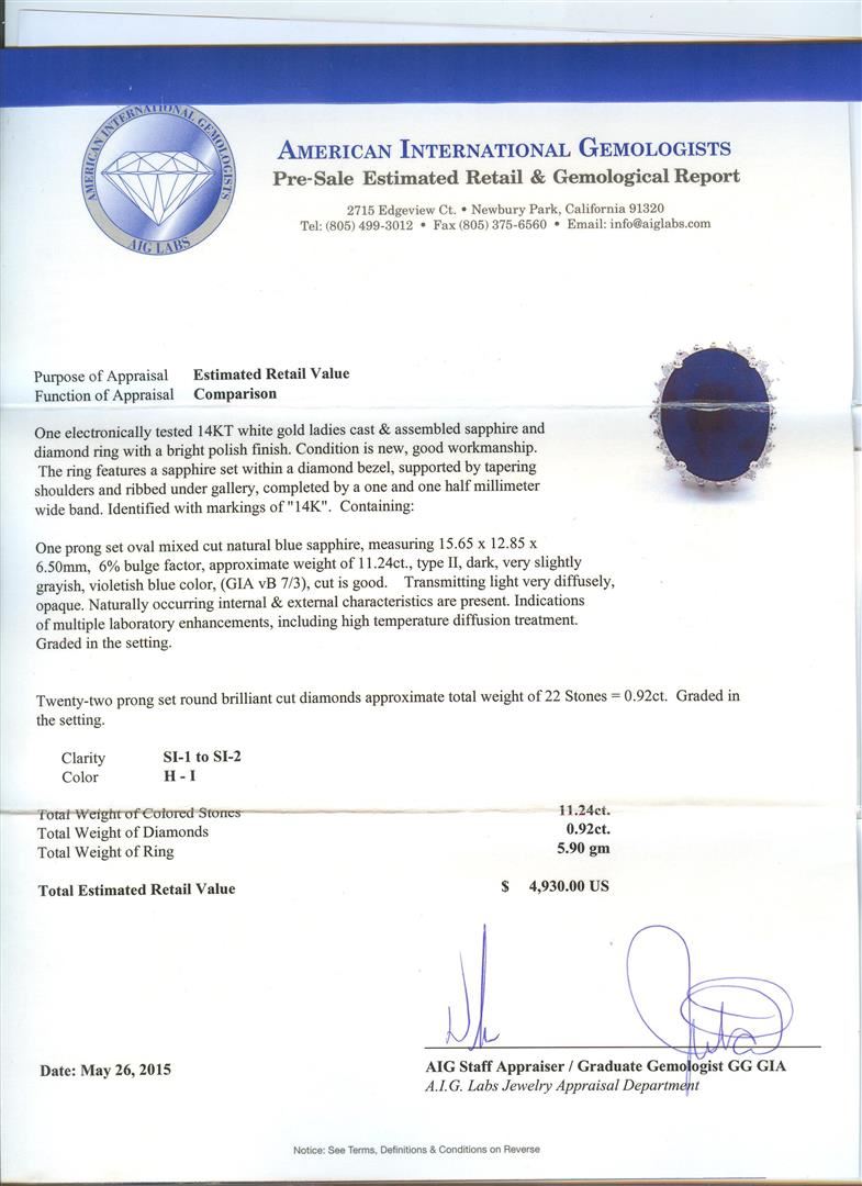 One electronically tested 14KT white gold ladies cast & assembled sapphire and diamond ring with a bright polish finish. The ring features a sapphire set within a diamond bezel, supported by tapering shoulders and ribbed under gallery, completed by a one and one half millimeter wide band. Identified with markings of "14K". Condition is new, good workmanship. Containing: One prong set oval mixed cut natural blue sapphire, measuring 15.65 x 12.85 x 6.50mm, 6%. bulge factor, approximate weight of 11.24ct., type II, dark, very slightly grayish, violetish blue color, (GIA vB 7/3), cut is good. Transmitting light very diffusely, opaque. Naturally occurring internal & external characteristics are present. Indications of multiple laboratory enhancements, including high temperature diffusion treatment. Graded in the setting. Twenty-Two prong set round brilliant cut diamonds approximate total weight of 22 Stones = 0.92ct. Graded in the setting. Clarity: SI-1 to SI-2. Color: H - I. Total Weight of Colored Stones 11.24ct. Total Weight of Diamonds 0.92ct. AIG Appraised at $4,930.00.