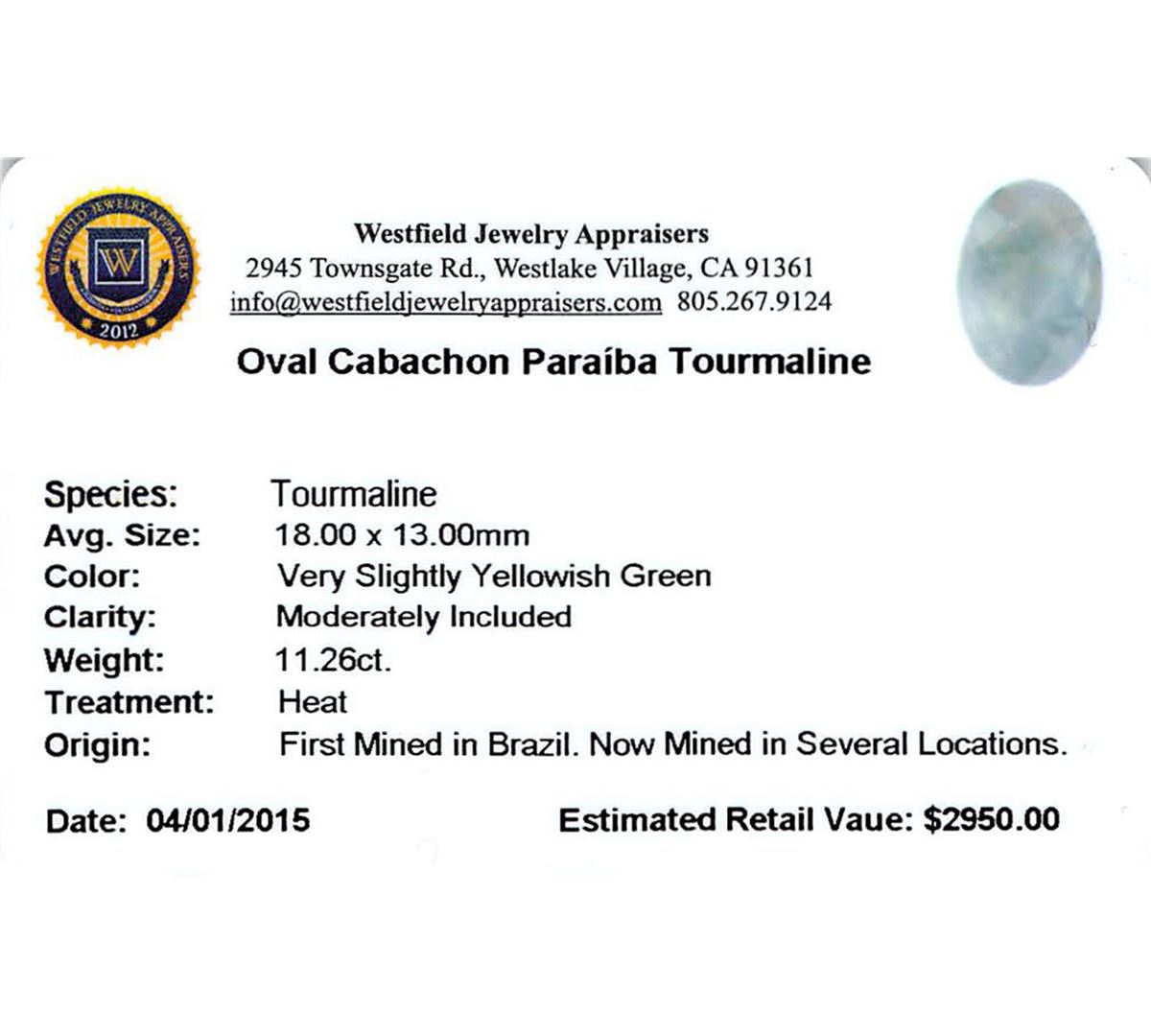 One oval cabochon cut natural Paraiba tourmaline exact weight 11.26ct., clarity is moderately included, cut is good. Westfield Appraised at $2,950.00.