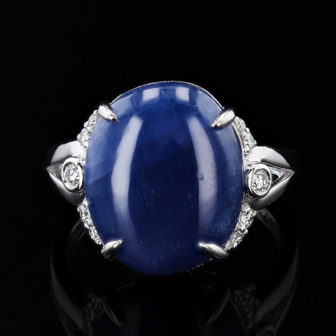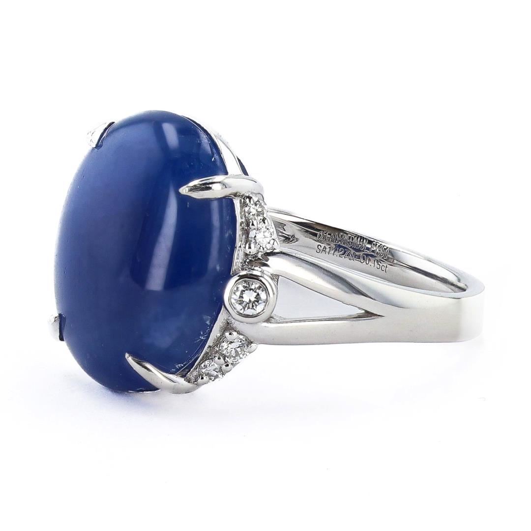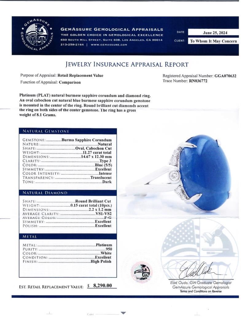 Platinum (PLAT) natural Burmese sapphire corundum and diamond ring. An oval cabochon cut natural blue Burmese sapphire corundum gemstone is mounted in the center of the ring. Round brilliant cut diamonds accent the ring on both sides of the center gemstone. The ring has a gross weight of 8.1 Grams. #NATURAL GEMSTONE# GEMSTONE: Burma Sapphire Corundum NATURE: Natural SHAPE: Oval Cabochon Cut WEIGHT: 11.27 carat total DIMENSIONS: 14.67 x 12.30mm CLARITY: Type 3 COLOR: Blue (5/5) SYMMETRY: Excellent COLOR INTENSITY: Intense TRANSPARENCY: Translucent TONE: Dark #NATURAL DIAMOND# SHAPE: Round Brilliant Cut WEIGHT: 0.15 carat total (10pcs.) DIMENSION: 2.2 x 1.2mm AVERAGE CLARITY: VS1-VS2 AVERAGE COLOR: F-G SYMMETRY: Excellent POLISH: Excellent #METAL# METAL: Platinum PURITY: 950 COLOR: White CONDITION: Excellent FINISH: High Polish #LREF-2291