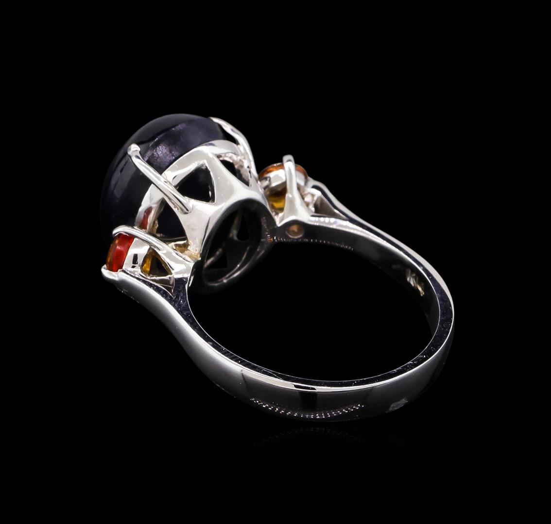 One ring featuring: 14KT white gold weighing 4.20 grams containing one blue sapphire with a total weight of 10.60ct and two orange sapphires with a total weight of 0.72ct.