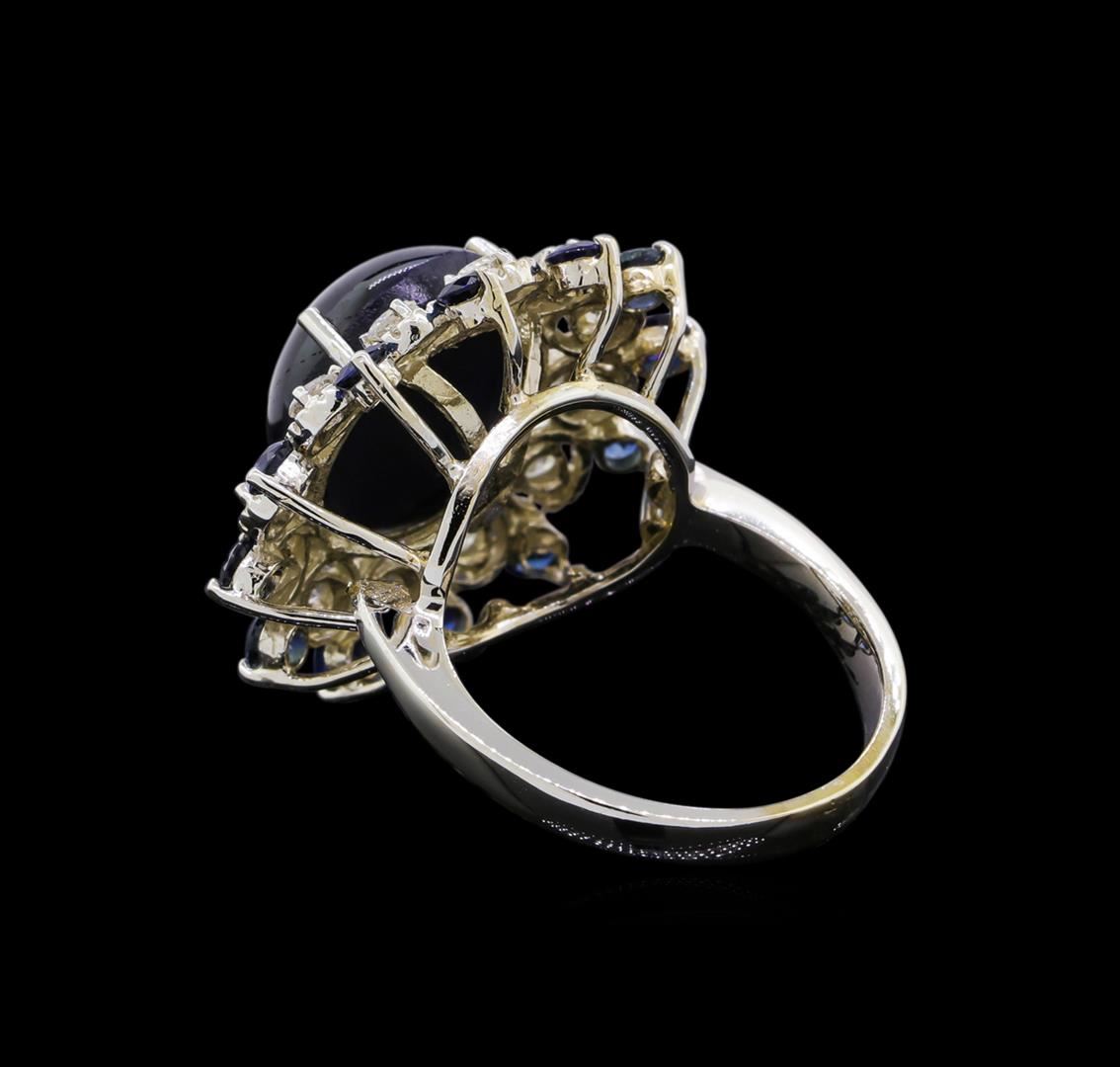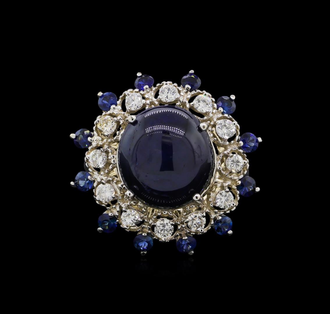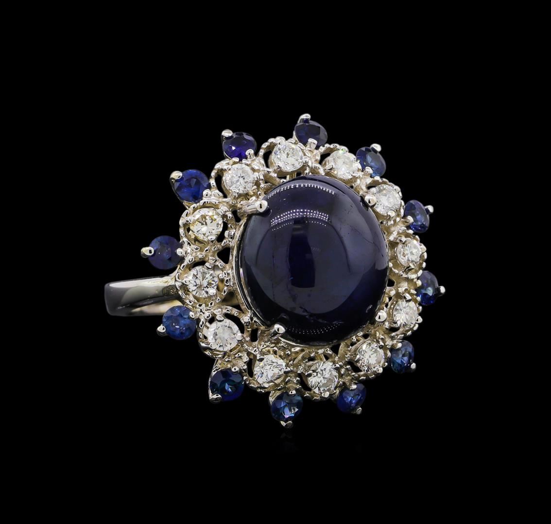 One electronically tested 14KT white gold ladies cast star sapphire, sapphire and diamond ring. The featured star sapphire is set within an inner diamond bezel and an outer sapphire bezel, completed by a two and one-half millimeter wide band. Bright polish finish with milgrain detailing. Identified with markings of "K14". Condition is new, good workmanship. Containing: One prong set oval cabochon cut natural blue star sapphire approximate weight of 10.05ct., dark, very slightly grayish, violetish blue color, (GIA vB 7/3), cut is good. This stone has a complete six ray star with strong intensity and excellent movement. Transmitting light very diffusely, opaque. Naturally occurring internal & external characteristics are present. Indications of laboratory high temperature diffusion treatment. Graded in the setting. Twelve prong set round brilliant cut natural blue sapphires, measuring 2.70 - 2.60 x 1.73 mm, approximate total weight of 1.30ct., clarity is slightly included, type II, dark, moderately strong, blue color, (GIA B 7/4), cut is good. Transmitting light with a minimum of distortion, transparent. Naturally occurring internal & external characteristics are present. Color grade is an average for the group. Graded in the setting. Twelve prong set round brilliant cut diamonds approximate total weight of 12 Stones = 0.68ct. Graded in the setting. Clarity: SI-2 to I-1. Color: G - I. Total Weight of Colored Stones 11.35ct. Total Weight of Diamonds 0.68ct. Total Weight of Ring 8.19gm. AIG Appraised at $6,285.00.