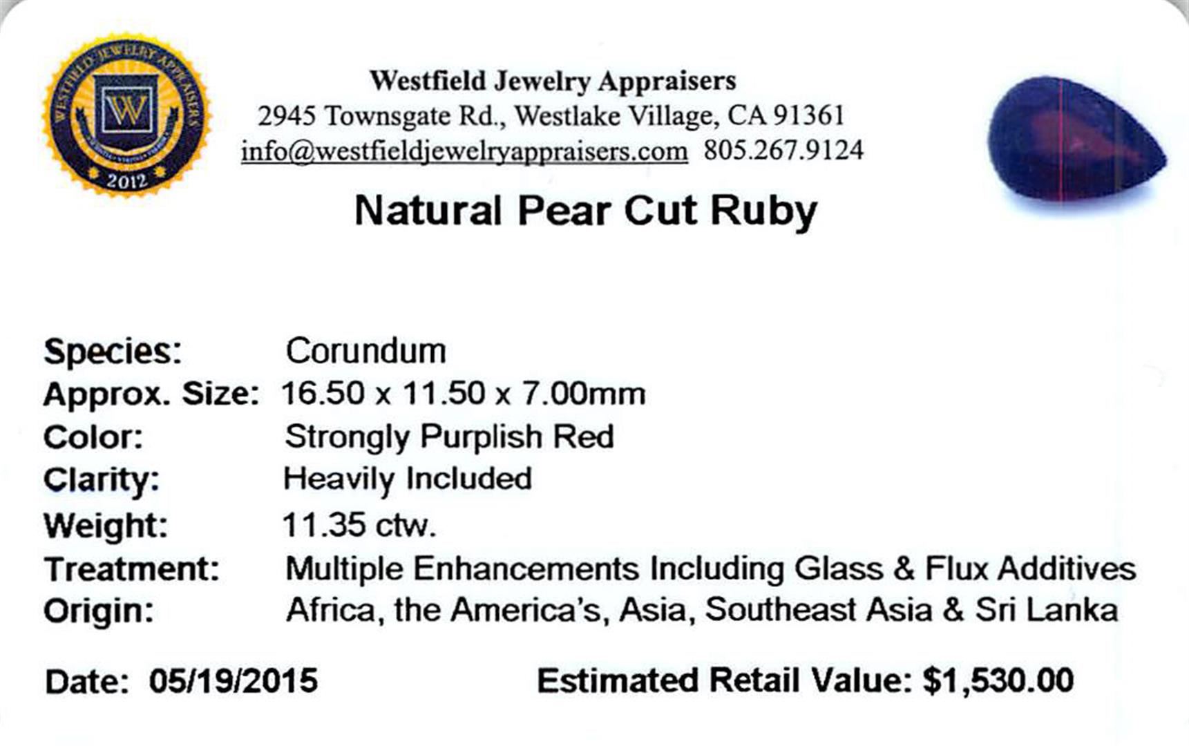 One pear mixed cut natural ruby, measuring 16.50 x 11.50 x 7.00mm, exact weight 11.35ct., clarity is heavily included, type II, dark, very slightly brownish, strongly purplish red color, (GIA stpR 7/3), cut is good. Transmitting light somewhat diffusely, transparent to translucent. Naturally occurring internal & external characteristics are present. Indications of laboratory high temperature heat treatment, with glass & flux additives. Ruby has a low tolerance to rhodium plating, repolishing the surface, & ultrasonic cleaning. Westfield Appraised at $1,530.00.