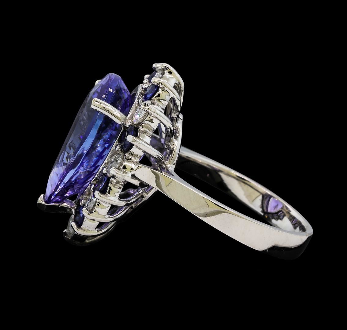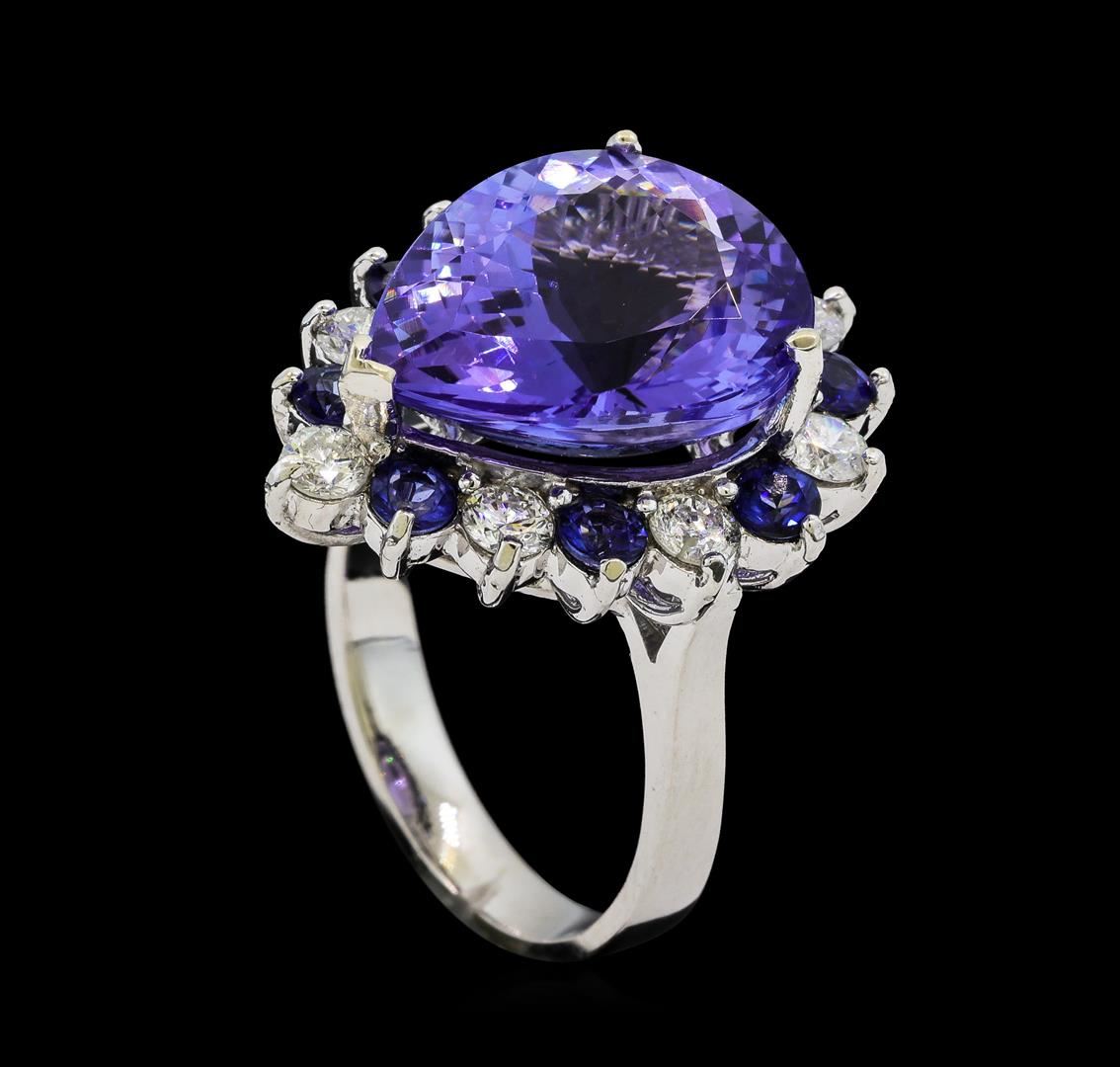 One electronically tested 14KT white gold lady's cast fashion ring with a basket halo with a bright polish finish. The featured lady's ring has a shank measuring 3.25 millimeters wide. Identified with markings of 'K14'. Condition is new, good workmanship. Containing: One prong set pear modified brilliant cut natural tanzanite, measuring 16.30 x 12.70 x 8.28mm, (depth est.) approximate weight of 10.42ct., clarity is eye clean, medium dark, very slightly grayish, bluish violet color, (GIA bV 6/3), cut is very good. Transmitting light with no distortion, transparent. Colored gemstones are presumed to have been subjected to commonly used enhancement processes. Graded in the setting. Eight prong set round modified brilliant cut natural blue sapphires, measuring 2.90 - 2.80 x 1.85 mm, (depth est.) approximate total weight of 0.96ct., clarity is eye clean, medium dark, strong, blue color, (GIA B 6/5), cut is very good. Transmitting light with no distortion, transparent. Colored gemstones are presumed to have been subjected to commonly used enhancement processes. Graded in the setting. Eight prong set round brilliant cut diamonds, measuring 3.10 - 3.05 x 1.91mm (depth est.) approximate total weight of 8 Stones = 0.88ct. Graded in the setting. Clarity SI-1 to I-1. Color: H - I Cut Good. Total Weight of Colored Stones 11.38ct.. Total Weight of Diamonds 0.88ct.. Total Weight of Ring 8.80gm. GAS Appraised at $18,185.00.