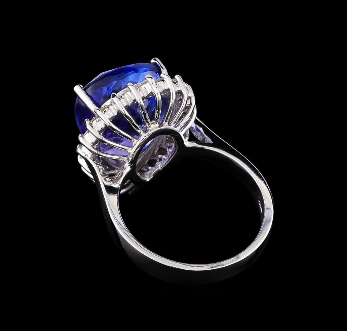 One electronically tested 14KT white gold lady's cast fashion ring with a basket halo with a bright polish finish. The featured lady's ring has a shank measuring 3.14 millimeters wide. Identified with markings of "K14". Condition is new, good workmanship. Containing: One prong set pear modified brilliant cut natural tanzanite, measuring 16.06 x 12.40 x 8.53mm, (depth est.) approximate weight of 11.38ct., clarity is eye clean, medium, very slightly grayish, violetish blue color, (GIA vB 5/3), cut is very good. Transmitting light with no distortion, transparent. Colored gemstones are presumed to have been subjected to commonly used enhancement processes. Graded in the setting. Twenty-Three prong set round brilliant cut diamonds, measuring 2.10 - 2.00 x 1.27mm (depth est.) approximate total weight of 23 Stones = 0.75ct. Graded in the setting. Clarity: SI-1 to SI-2. Color: G - Good. Total Weight of Colored Stones 11.38ct. Total Weight of Diamonds 0.75ct. Total Weight of Ring 8.40gm GAS Appraised.