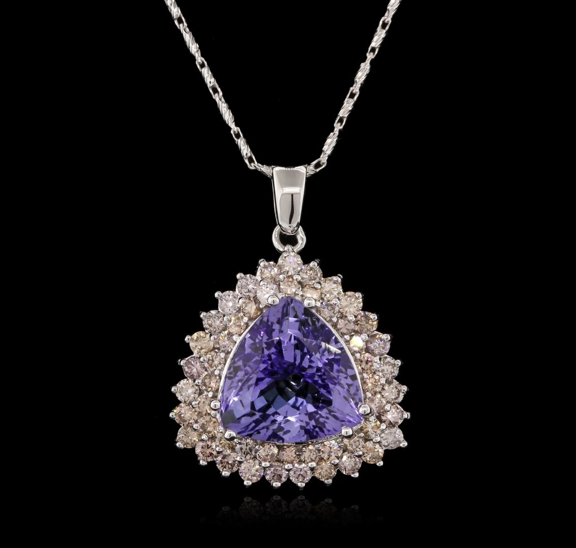 One electronically tested 14KT white gold ladies cast tanzanite and diamond pendant & chain 18.0" long, with a lobster claw clasp with a bright polish finish. Identified with markings of "14K". Condition is new. Containing: One prong set triangle modified brilliant cut natural tanzanite, measuring 14.45 x 14.35 x 9.10mm, approximate weight of 11.38ct., clarity is eye clean, type I, medium, moderately strong, violet color, (GIA V 5/4), cut is good. Fifty-One prong set round brilliant cut diamonds, measuring 2.50 - 2.00 x 1.35mm (depth est.) approximate. Total Weight of 51 Stones = 2.12ct. Clarity: SI-1, Cut is Good. Colored gemstones are presumed to have been subjected to commonly used enhancement processes. All diamonds and colored gemstones are graded in the mounting, unless otherwise stated. Total Weight of Colored Stones 11.38ct. Total Weight of Diamonds 2.12ct. Total Weight of Pendant & Chain 14.60 grams. GGL Appraised at $7,900.00.