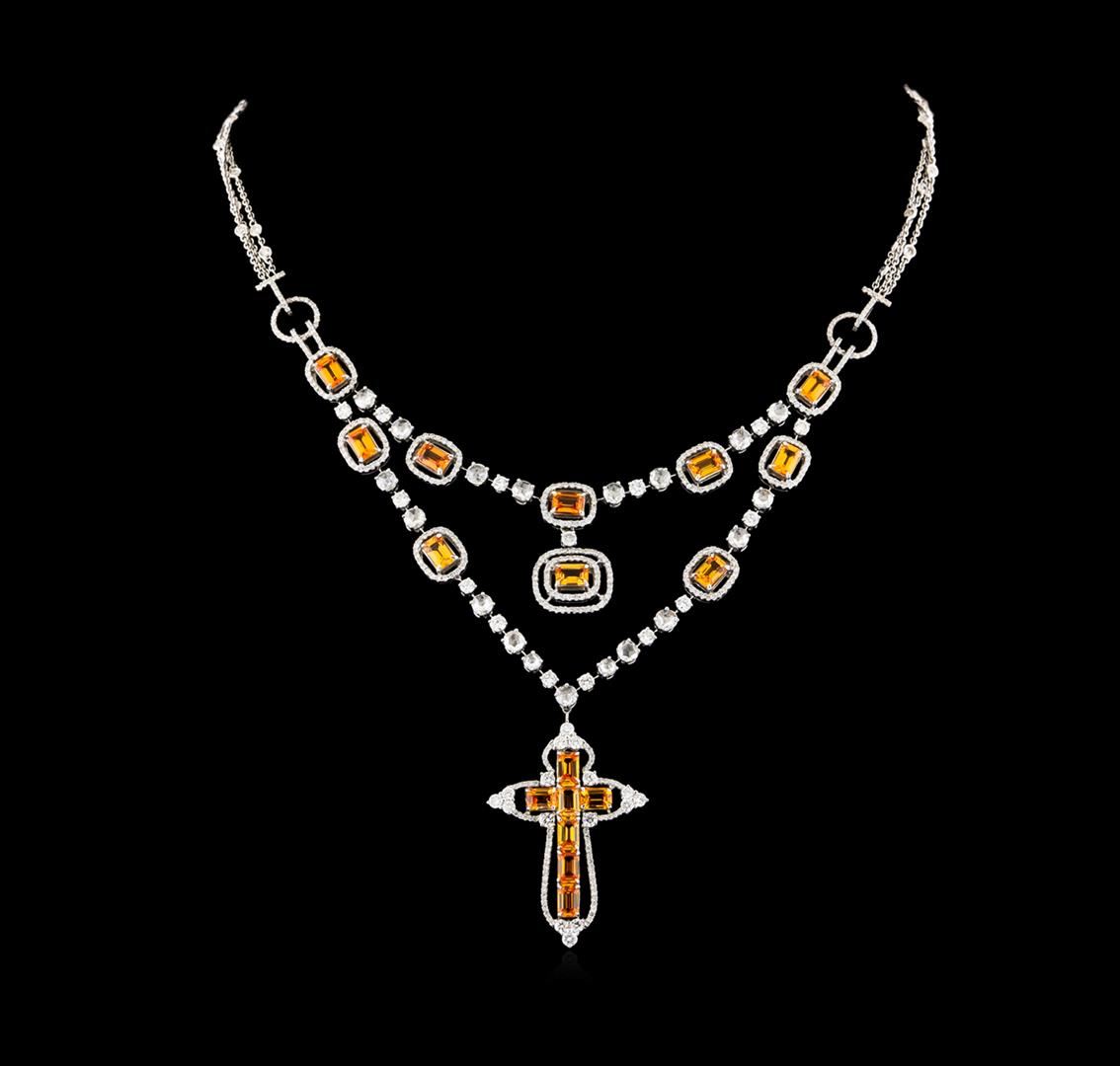 One electronically tested 18KT white gold lady's combination cast & assembled fashion cross necklace with a lobster claw clasp with a bright polish finish. The featured lady's cross necklace has a adjustable triple strand attached chain from 16 to 18 inches in length. Identified with markings of "18K 750". Condition is new, good workmanship. Containing: Seventeen prong set emerald step cut natural orange sapphires, measuring 6.00 x 4.00 x 2.60mm, (depth est.) approximate total weight of 11.41ct., clarity is eye clean, medium light, moderately strong, yellowish orange color, (GIA yO 4/4), cut is good. Transmitting light with no distortion, transparent. Colored gemstones are presumed to have been subjected to commonly used enhancement processes. Graded in the setting. Nineteen prong set rose cut diamonds, measuring 4.00 - 3.20 x 3.00mm (depth est.) approximate total weight of 19 Stones = 3.66ct. Graded in the setting. Clarity: SI-1 to SI-2. Color: G - Good Thirty-One prong set round brilliant cut diamonds, measuring 2.80 - 2.60 x 1.65mm (depth est.) approximate total weight of 31 Stones = 2.30ct. Graded in the setting. Clarity: SI-1 to SI-2. Color: G - Good Eighteen bezel set round brilliant cut diamonds, measuring 2.00 - 1.80 x 1.14mm (depth est.) approximate total weight of 18 Stones = 0.45ct. Graded in the setting. Clarity: SI-1 to SI-2. Color: G - Good Four Hundred Sixty prong set round brilliant cut diamonds, measuring 1.20 - 1.15 x 0.71mm (depth est.) approximate total weight of 460 Stones = 2.71ct. Graded in the setting. Clarity: SI-2 to I-1. Color: H - I. Cut Good. Total Weight of Colored Stones 11.41ct. Total Weight of Diamonds 9.12ct. Total Weight of Cross Necklace 40.20gm. GAS Appraised at $32,325.00.