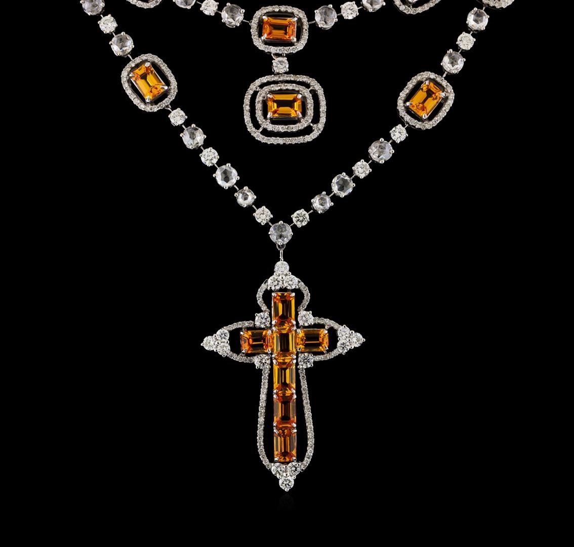 One electronically tested 18KT white gold lady's combination cast & assembled fashion cross necklace with a lobster claw clasp with a bright polish finish. The featured lady's cross necklace has a adjustable triple strand attached chain from 16 to 18 inches in length. Identified with markings of "18K 750". Condition is new, good workmanship. Containing: Seventeen prong set emerald step cut natural orange sapphires, measuring 6.00 x 4.00 x 2.60mm, (depth est.) approximate total weight of 11.41ct., clarity is eye clean, medium light, moderately strong, yellowish orange color, (GIA yO 4/4), cut is good. Transmitting light with no distortion, transparent. Colored gemstones are presumed to have been subjected to commonly used enhancement processes. Graded in the setting. Nineteen prong set rose cut diamonds, measuring 4.00 - 3.20 x 3.00mm (depth est.) approximate total weight of 19 Stones = 3.66ct. Graded in the setting. Clarity: SI-1 to SI-2. Color: G - Good Thirty-One prong set round brilliant cut diamonds, measuring 2.80 - 2.60 x 1.65mm (depth est.) approximate total weight of 31 Stones = 2.30ct. Graded in the setting. Clarity: SI-1 to SI-2. Color: G - Good Eighteen bezel set round brilliant cut diamonds, measuring 2.00 - 1.80 x 1.14mm (depth est.) approximate total weight of 18 Stones = 0.45ct. Graded in the setting. Clarity: SI-1 to SI-2. Color: G - Good Four Hundred Sixty prong set round brilliant cut diamonds, measuring 1.20 - 1.15 x 0.71mm (depth est.) approximate total weight of 460 Stones = 2.71ct. Graded in the setting. Clarity: SI-2 to I-1. Color: H - I. Cut Good. Total Weight of Colored Stones 11.41ct. Total Weight of Diamonds 9.12ct. Total Weight of Cross Necklace 40.20gm. GAS Appraised at $32,325.00.
