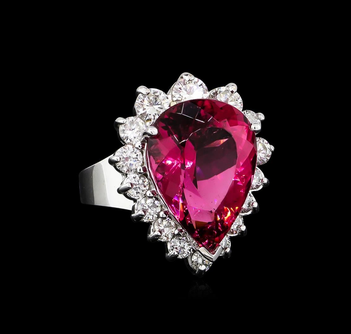 One electronically tested 14KT white gold ladies cast pink tourmaline & diamond ring with a bright finish. Identified with markings of "14K". Condition is new, good workmanship. Containing: One prong set pear mixed cut natural pink tourmaline, measuring 17.80 x 13.15 x 8.90mm, approximate weight of 11.41ct., clarity is slightly included, type II, medium, slightly brownish, strongly purplish red color, (GIA stpR 5/2), cut is good. Transmitting light with no distortion, transparent. Naturally occurring internal characteristics are present. Colored Stone Grading Report attached. Graded in the setting. Sixteen prong set round brilliant cut diamonds, measuring 4.40 - 2.60 x 2.10mm (depth est.) approximate total weight of 16 Stones = 1.99ct. Graded in the setting. Clarity: SI-2 to I-1. Color: G - I. Total Weight of Colored Stones 11.41ct. Total Weight of Diamonds 1.99ct. AIG Appraised at $20,450.00.