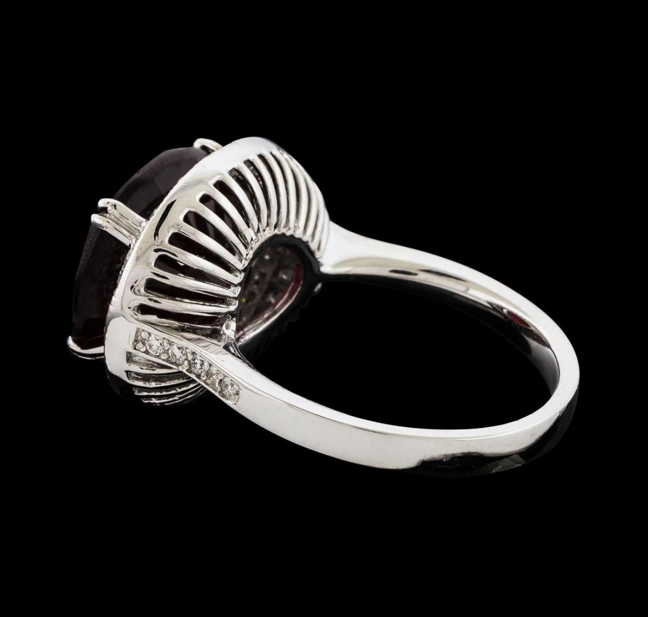 One Ruby and Diamond Ring featuring: 14KT White Gold with a total weight of 5.04 grams, One Ruby stone with a total weight of 11.48ct, and 44 Diamonds with a total weight of 0.34ctw.
