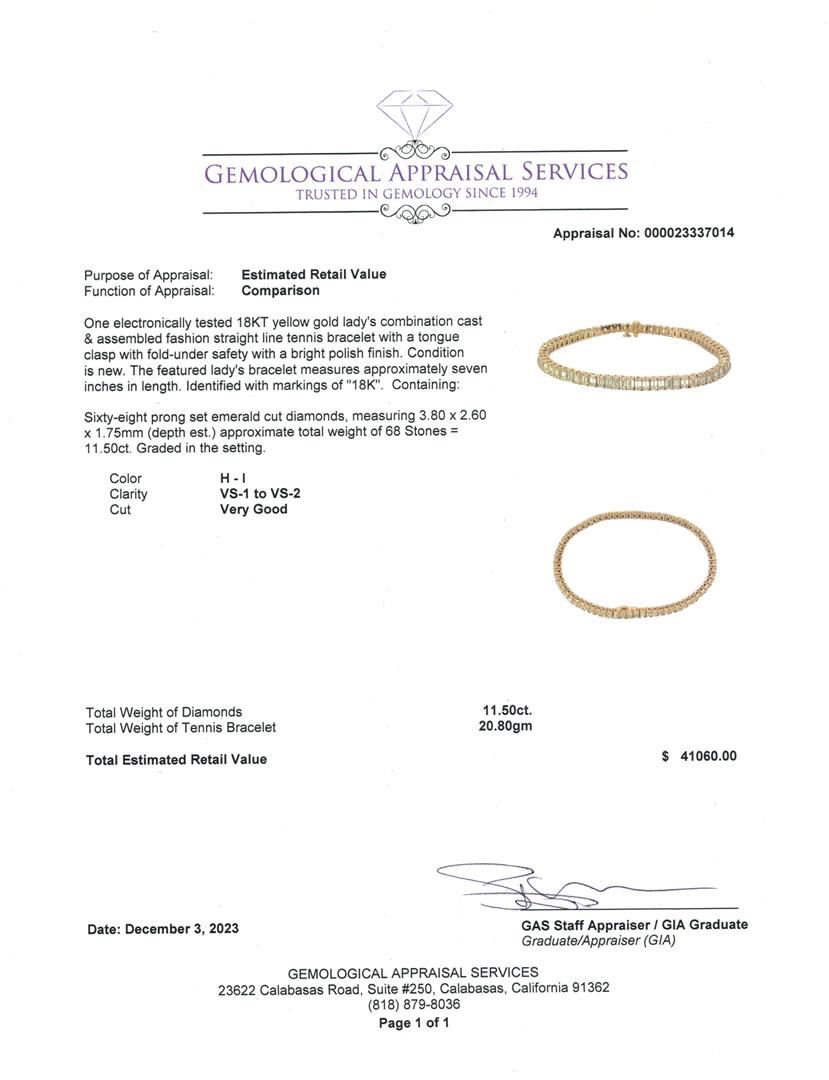 One new 11.50 ctw Diamond Tennis Bracelet - 18KT Yellow Gold. Appraisal Value: $41060. See appraisal for full details.