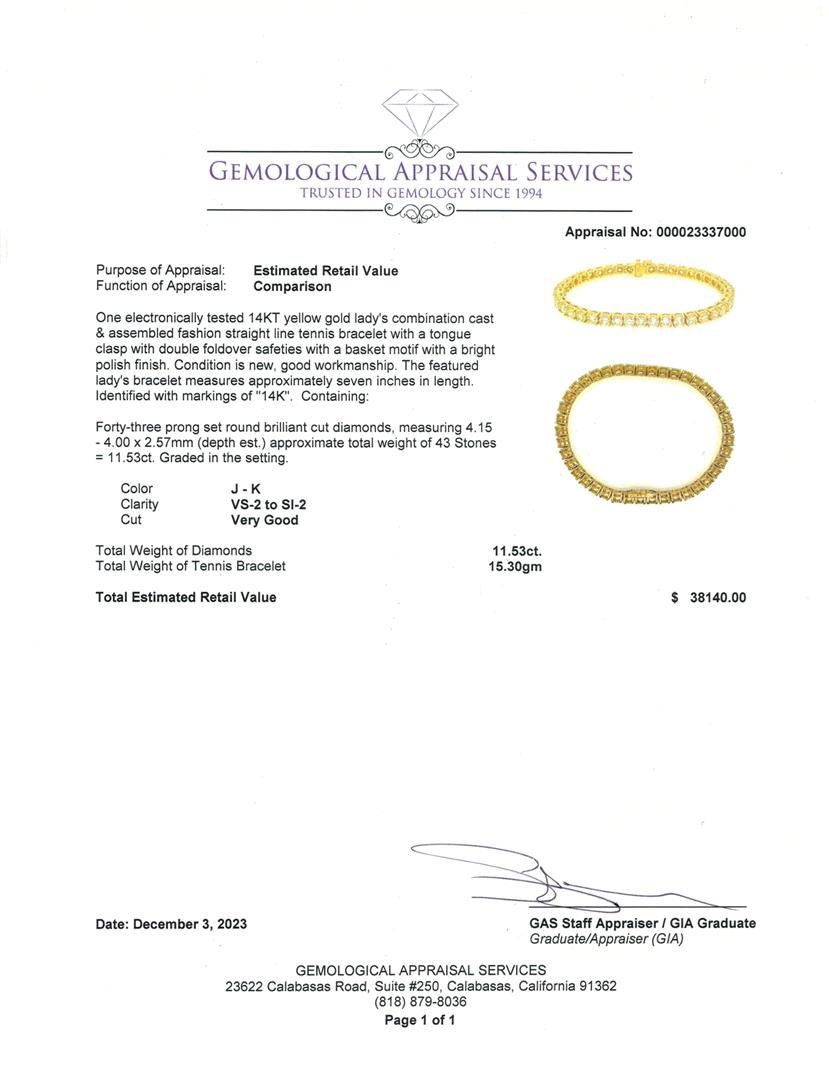 One new 11.53 ctw Diamond Tennis Bracelet - 14KT Yellow Gold. Appraisal Value: $38140. See appraisal for full details.