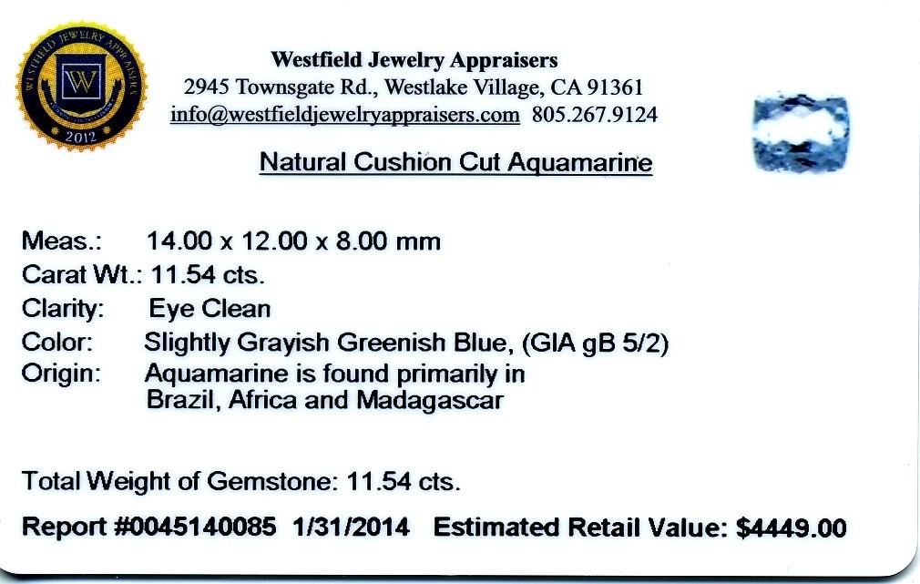 11.54ct. Natural Cushion Cut Aquamarine Westfield Appraised at $4,449.00.