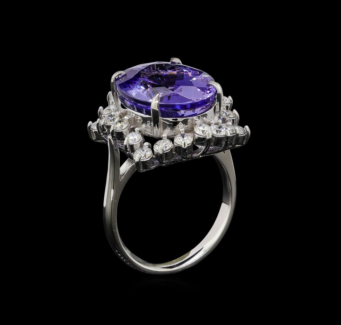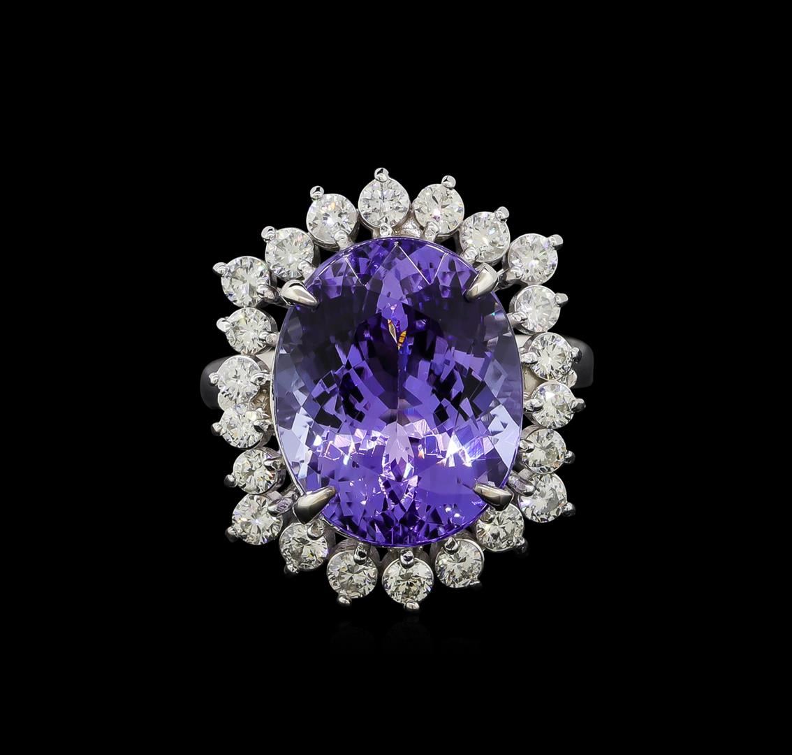 One electronically tested 14KT white gold lady's cast fashion ring with a staggered basket halo with a bright polish finish. The featured lady's ring has a shank measuring 2.65 millimeters wide. Identified with markings of 'K14'. Condition is new, good workmanship. Containing: One prong set oval modified brilliant cut natural tanzanite, measuring 15.32 x 12.33 x 8.65mm, (depth est.) approximate weight of 11.57ct., clarity is eye clean, medium light, moderately strong, bluish violet color, (GIA bV 4/4), cut is very good. Transmitting light with no distortion, transparent. Colored gemstones are presumed to have been subjected to commonly used enhancement processes. Graded in the setting. Fourteen prong set round brilliant cut diamonds, measuring 2.50 - 2.40 x 1.52mm (depth est.) approximate total weight of 14 Stones = 0.77ct. Graded in the setting. Clarity SI-1 to I-1. Color: G - H Cut Good Eight prong set round brilliant cut diamonds, measuring 2.30 - 2.20 x 1.35mm (depth est.) approximate total weight of 8 Stones = 0.33ct. Graded in the setting. Clarity SI-1 to I-1. Color: G - H Cut Good. Total Weight of Colored Stones 11.57ct.. Total Weight of Diamonds 1.10ct.. Total Weight of Ring 8.20gm GAS Appraised at $20,145.00.
