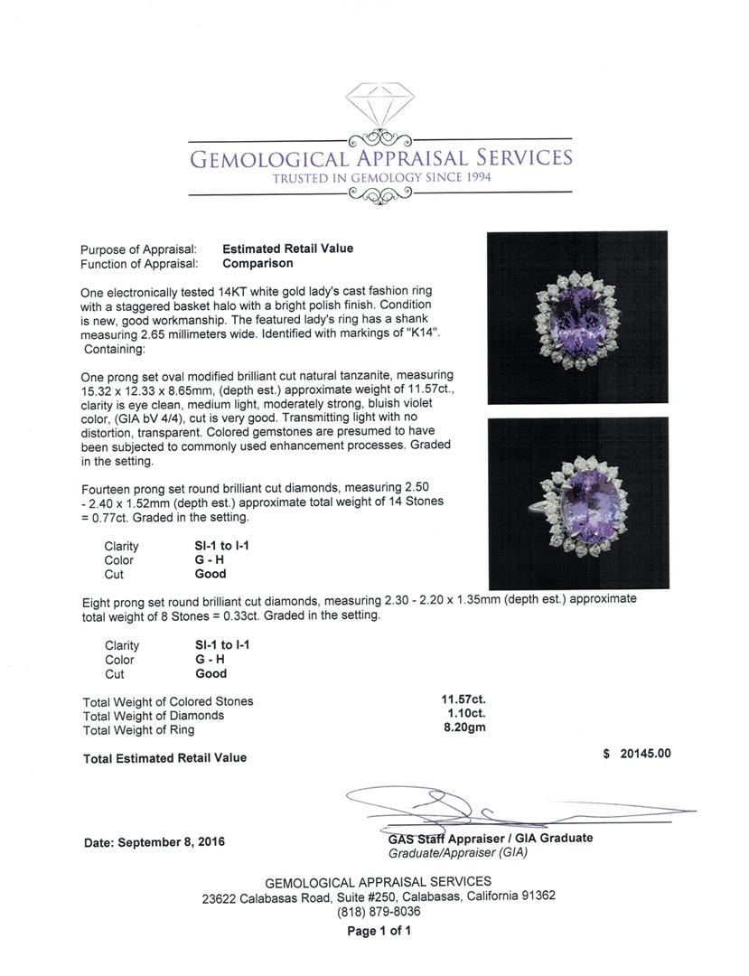 One electronically tested 14KT white gold lady's cast fashion ring with a staggered basket halo with a bright polish finish. The featured lady's ring has a shank measuring 2.65 millimeters wide. Identified with markings of 'K14'. Condition is new, good workmanship. Containing: One prong set oval modified brilliant cut natural tanzanite, measuring 15.32 x 12.33 x 8.65mm, (depth est.) approximate weight of 11.57ct., clarity is eye clean, medium light, moderately strong, bluish violet color, (GIA bV 4/4), cut is very good. Transmitting light with no distortion, transparent. Colored gemstones are presumed to have been subjected to commonly used enhancement processes. Graded in the setting. Fourteen prong set round brilliant cut diamonds, measuring 2.50 - 2.40 x 1.52mm (depth est.) approximate total weight of 14 Stones = 0.77ct. Graded in the setting. Clarity SI-1 to I-1. Color: G - H Cut Good Eight prong set round brilliant cut diamonds, measuring 2.30 - 2.20 x 1.35mm (depth est.) approximate total weight of 8 Stones = 0.33ct. Graded in the setting. Clarity SI-1 to I-1. Color: G - H Cut Good. Total Weight of Colored Stones 11.57ct.. Total Weight of Diamonds 1.10ct.. Total Weight of Ring 8.20gm GAS Appraised at $20,145.00.