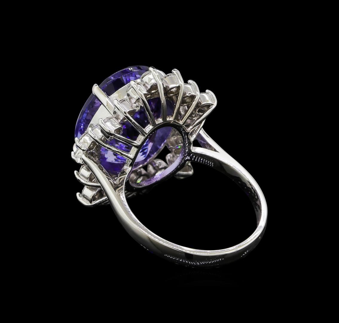One electronically tested 14KT white gold lady's cast fashion ring with a staggered basket halo with a bright polish finish. The featured lady's ring has a shank measuring 2.65 millimeters wide. Identified with markings of 'K14'. Condition is new, good workmanship. Containing: One prong set oval modified brilliant cut natural tanzanite, measuring 15.32 x 12.33 x 8.65mm, (depth est.) approximate weight of 11.57ct., clarity is eye clean, medium light, moderately strong, bluish violet color, (GIA bV 4/4), cut is very good. Transmitting light with no distortion, transparent. Colored gemstones are presumed to have been subjected to commonly used enhancement processes. Graded in the setting. Fourteen prong set round brilliant cut diamonds, measuring 2.50 - 2.40 x 1.52mm (depth est.) approximate total weight of 14 Stones = 0.77ct. Graded in the setting. Clarity SI-1 to I-1. Color: G - H Cut Good Eight prong set round brilliant cut diamonds, measuring 2.30 - 2.20 x 1.35mm (depth est.) approximate total weight of 8 Stones = 0.33ct. Graded in the setting. Clarity SI-1 to I-1. Color: G - H Cut Good. Total Weight of Colored Stones 11.57ct.. Total Weight of Diamonds 1.10ct.. Total Weight of Ring 8.20gm GAS Appraised at $20,145.00.