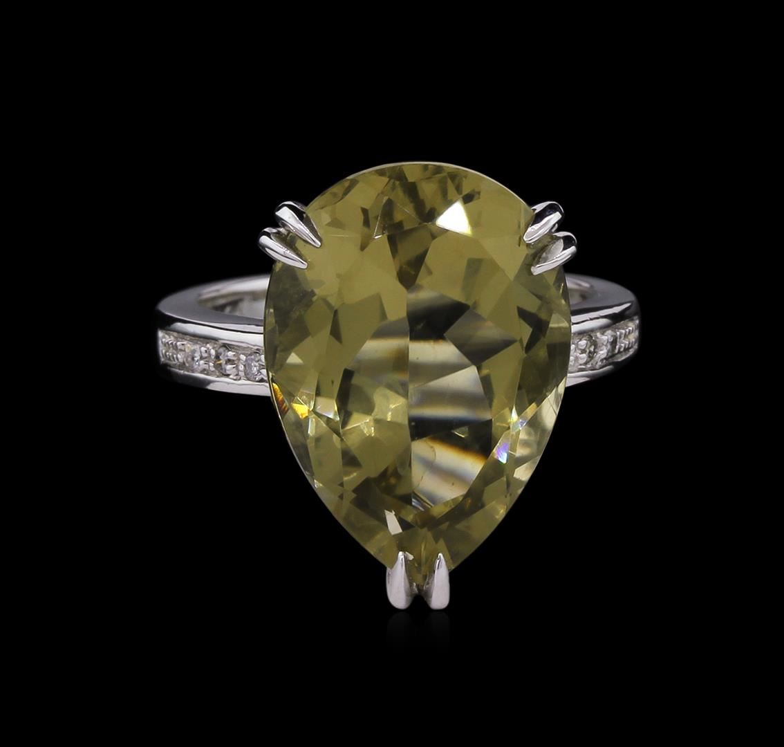 One ring featuring: 14KT white gold weighing 7.00 grams containing one lemon quartz center stone with a total weight of 11.60ct and diamonds with a total weight of 0.05ct.