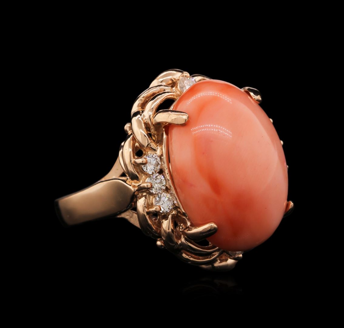 One ring featuring: 14KT rose gold weighing 8.58 grams containing one coral center stone with a total weight of 11.60ct and eight diamonds with a total weight of 0.30ct.
