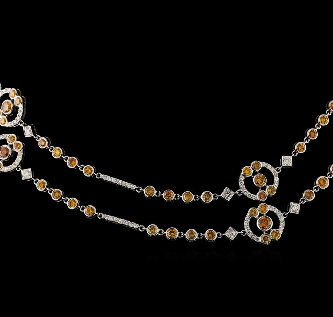 One electronically tested 18KT white gold lady's combination cast & assembled fashion necklace with a lobster claw clasp with a bright polish finish. The featured lady's necklace measures 32.5 inches in length. Trademark is MICHA. Identified with markings of "18K". Condition is new, good workmanship. Containing: Seven bezel set round brilliant cut diamonds, measuring 4.20 - 3.90 x 2.43mm (depth est.) approximate total weight of 7 Stones = 1.75ct. Colored gemstones are presumed to have been subjected to commonly used enhancement processes. Graded in the setting. Clarity: SI-1 to SI-2 Cut Very Good One Hundred bezel set round brilliant cut diamonds, measuring 2.80 - 2.70 x 1.65mm (depth est.) approximate total weight of 100 Stones = 7.61ct. Colored gemstones are presumed to have been subjected to commonly used enhancement processes. Graded in the setting. Clarity: SI-1 to SI-2 Cut Good Sixteen prong set round brilliant cut diamonds, measuring 2.80 - 2.70 x 1.65mm (depth est.) approximate total weight of 16 Stones = 1.22ct. Graded in the setting. Clarity: SI-1 to SI-2. Color: G - Good Eighty-Four prong set round brilliant cut diamonds, measuring 1.50 - 1.45 x 0.92mm (depth est.) approximate total weight of 84 Stones = 1.03ct. Graded in the setting. Clarity: SI-1 to SI-2. Color: H - I. Cut Good. Total Weight of Diamonds 11.61ct. Total Weight of Necklace 35.50gm. GAS Appraised at $28,085.00.
