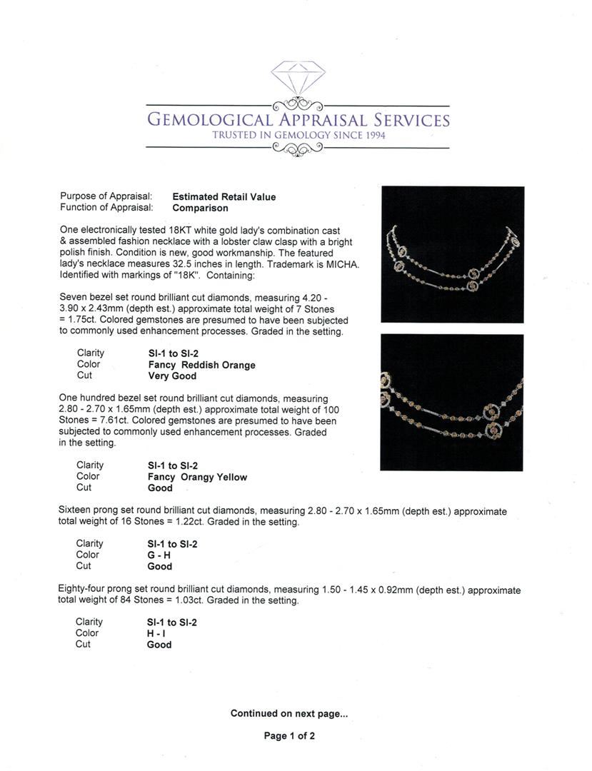 One electronically tested 18KT white gold lady's combination cast & assembled fashion necklace with a lobster claw clasp with a bright polish finish. The featured lady's necklace measures 32.5 inches in length. Trademark is MICHA. Identified with markings of "18K". Condition is new, good workmanship. Containing: Seven bezel set round brilliant cut diamonds, measuring 4.20 - 3.90 x 2.43mm (depth est.) approximate total weight of 7 Stones = 1.75ct. Colored gemstones are presumed to have been subjected to commonly used enhancement processes. Graded in the setting. Clarity: SI-1 to SI-2 Cut Very Good One Hundred bezel set round brilliant cut diamonds, measuring 2.80 - 2.70 x 1.65mm (depth est.) approximate total weight of 100 Stones = 7.61ct. Colored gemstones are presumed to have been subjected to commonly used enhancement processes. Graded in the setting. Clarity: SI-1 to SI-2 Cut Good Sixteen prong set round brilliant cut diamonds, measuring 2.80 - 2.70 x 1.65mm (depth est.) approximate total weight of 16 Stones = 1.22ct. Graded in the setting. Clarity: SI-1 to SI-2. Color: G - Good Eighty-Four prong set round brilliant cut diamonds, measuring 1.50 - 1.45 x 0.92mm (depth est.) approximate total weight of 84 Stones = 1.03ct. Graded in the setting. Clarity: SI-1 to SI-2. Color: H - I. Cut Good. Total Weight of Diamonds 11.61ct. Total Weight of Necklace 35.50gm. GAS Appraised at $28,085.00.