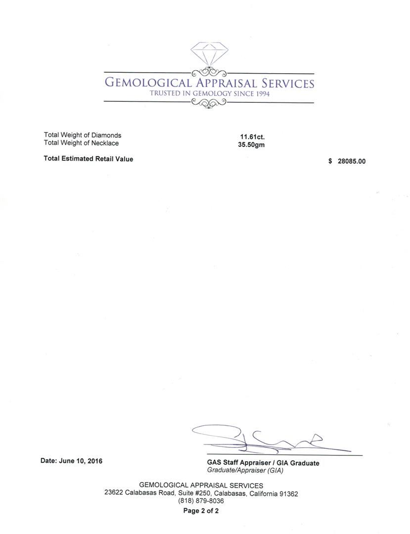 One electronically tested 18KT white gold lady's combination cast & assembled fashion necklace with a lobster claw clasp with a bright polish finish. The featured lady's necklace measures 32.5 inches in length. Trademark is MICHA. Identified with markings of "18K". Condition is new, good workmanship. Containing: Seven bezel set round brilliant cut diamonds, measuring 4.20 - 3.90 x 2.43mm (depth est.) approximate total weight of 7 Stones = 1.75ct. Colored gemstones are presumed to have been subjected to commonly used enhancement processes. Graded in the setting. Clarity: SI-1 to SI-2 Cut Very Good One Hundred bezel set round brilliant cut diamonds, measuring 2.80 - 2.70 x 1.65mm (depth est.) approximate total weight of 100 Stones = 7.61ct. Colored gemstones are presumed to have been subjected to commonly used enhancement processes. Graded in the setting. Clarity: SI-1 to SI-2 Cut Good Sixteen prong set round brilliant cut diamonds, measuring 2.80 - 2.70 x 1.65mm (depth est.) approximate total weight of 16 Stones = 1.22ct. Graded in the setting. Clarity: SI-1 to SI-2. Color: G - Good Eighty-Four prong set round brilliant cut diamonds, measuring 1.50 - 1.45 x 0.92mm (depth est.) approximate total weight of 84 Stones = 1.03ct. Graded in the setting. Clarity: SI-1 to SI-2. Color: H - I. Cut Good. Total Weight of Diamonds 11.61ct. Total Weight of Necklace 35.50gm. GAS Appraised at $28,085.00.