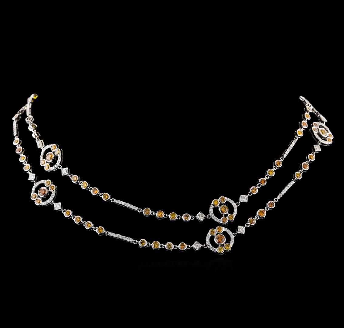 One electronically tested 18KT white gold lady's combination cast & assembled fashion necklace with a lobster claw clasp with a bright polish finish. The featured lady's necklace measures 32.5 inches in length. Trademark is MICHA. Identified with markings of "18K". Condition is new, good workmanship. Containing: Seven bezel set round brilliant cut diamonds, measuring 4.20 - 3.90 x 2.43mm (depth est.) approximate total weight of 7 Stones = 1.75ct. Colored gemstones are presumed to have been subjected to commonly used enhancement processes. Graded in the setting. Clarity: SI-1 to SI-2 Cut Very Good One Hundred bezel set round brilliant cut diamonds, measuring 2.80 - 2.70 x 1.65mm (depth est.) approximate total weight of 100 Stones = 7.61ct. Colored gemstones are presumed to have been subjected to commonly used enhancement processes. Graded in the setting. Clarity: SI-1 to SI-2 Cut Good Sixteen prong set round brilliant cut diamonds, measuring 2.80 - 2.70 x 1.65mm (depth est.) approximate total weight of 16 Stones = 1.22ct. Graded in the setting. Clarity: SI-1 to SI-2. Color: G - Good Eighty-Four prong set round brilliant cut diamonds, measuring 1.50 - 1.45 x 0.92mm (depth est.) approximate total weight of 84 Stones = 1.03ct. Graded in the setting. Clarity: SI-1 to SI-2. Color: H - I. Cut Good. Total Weight of Diamonds 11.61ct. Total Weight of Necklace 35.50gm. GAS Appraised at $28,085.00.