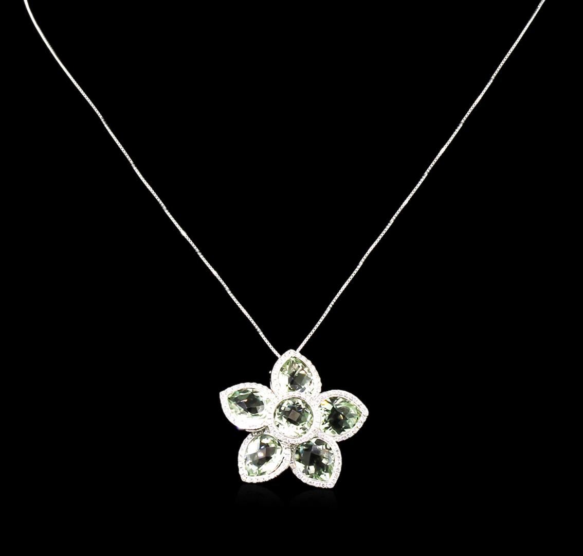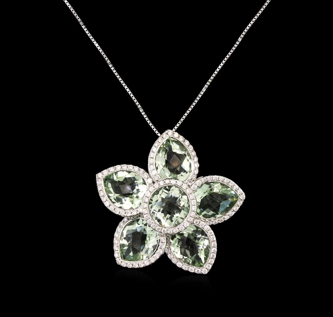 One pendant with chain featuring: 14KT white gold weighing 8.00 grams containing green amethysts with a total weight of 11.63ct and diamonds with a total weight of 0.80ct.